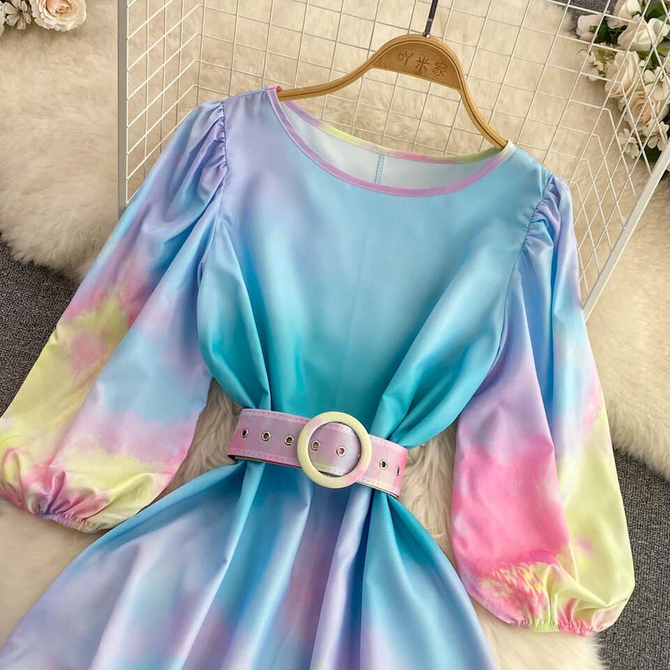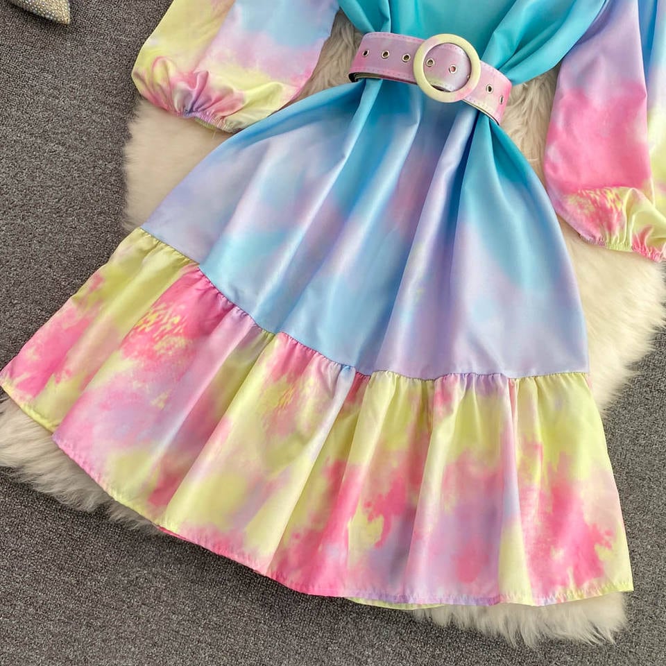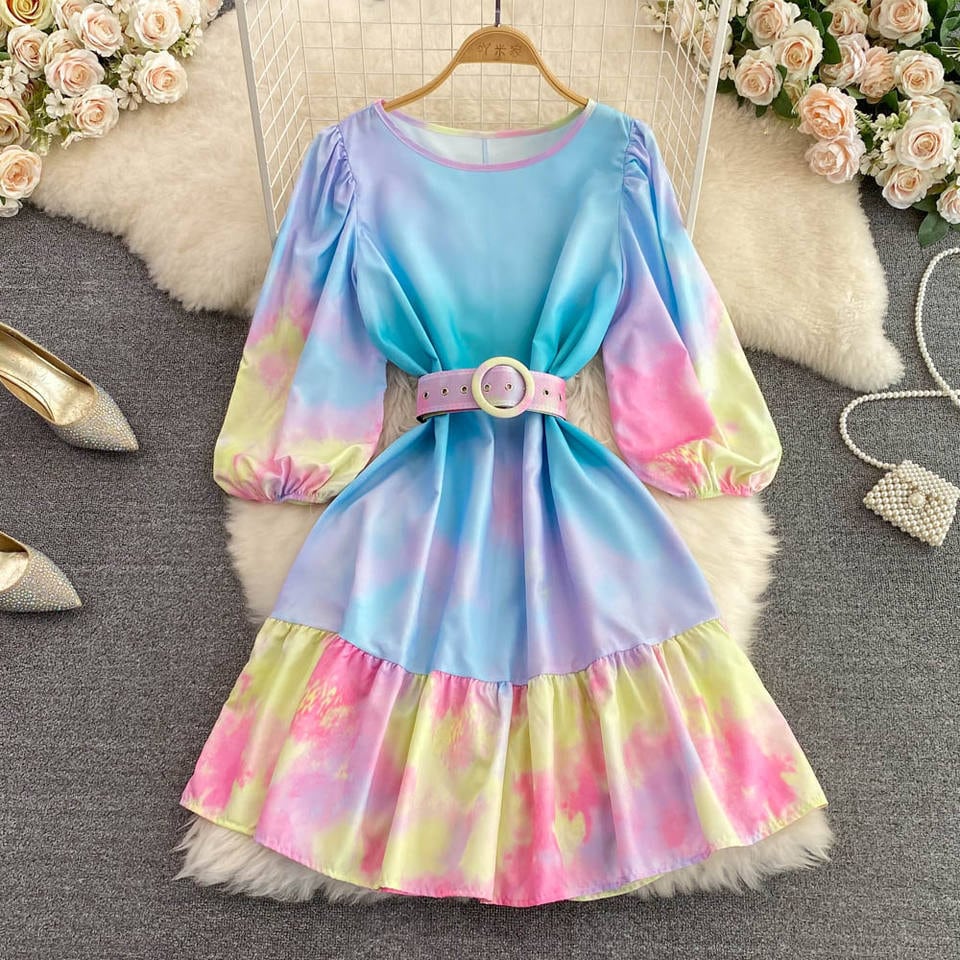 SALE 送料無料 ◆ D1310 ベルト付き マーブル バルーンスリーブ ミニ ワンピース《 パステル 》ピンク ライトブルー イエロー マーブルカラー カラフル マルチカラー キャンディーカラー パステル カラフルワンピース インポートワンピース パーティードレス 衣装 メール便 パーティーワンピ 袖付き お食事 ミディ おしゃれ 無地 ロングワンピース 袖あり インポートワンピース お呼ばれ 結婚式 お出かけ 衣装 ミニワンピ