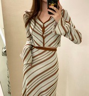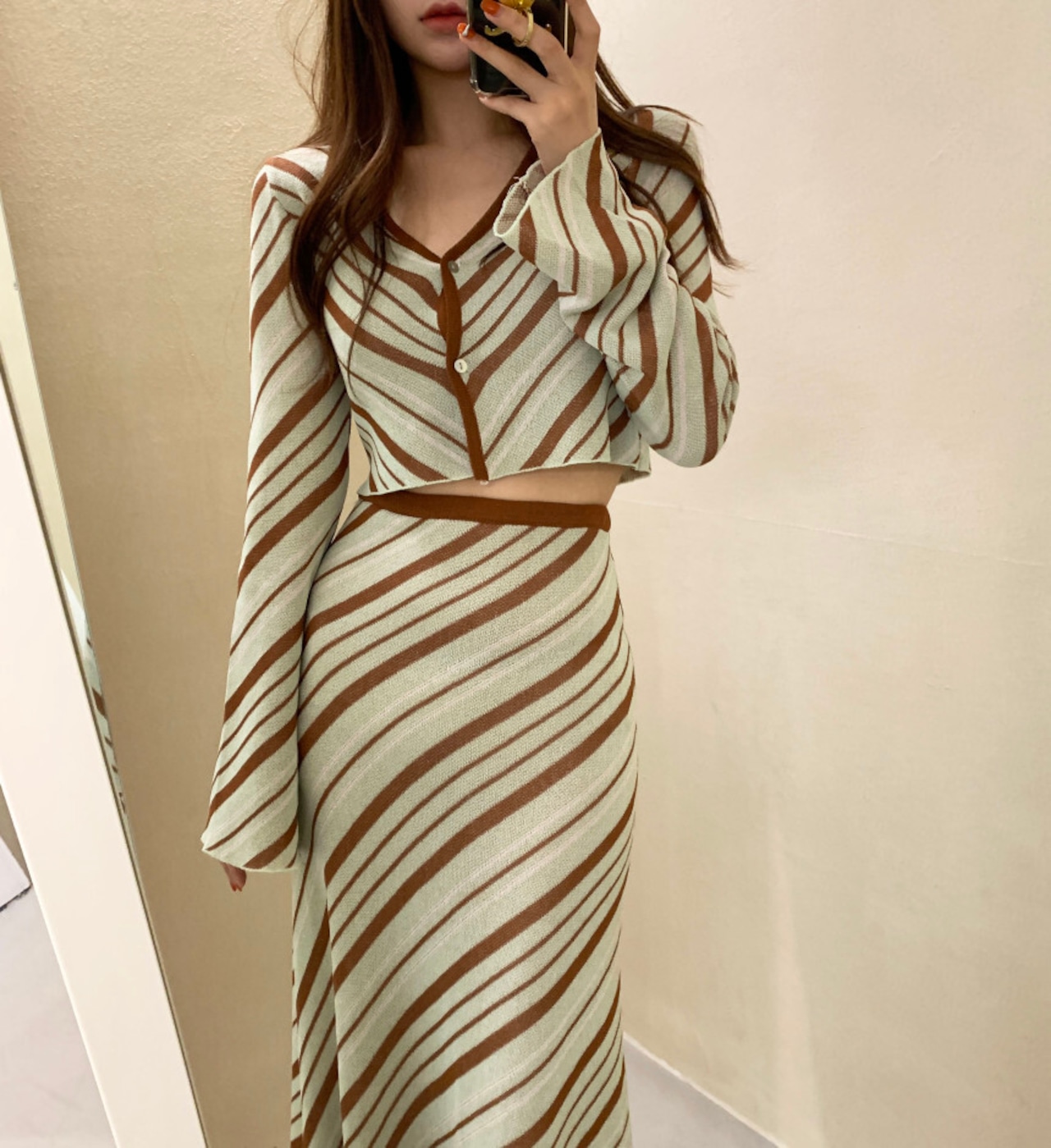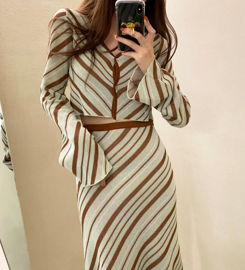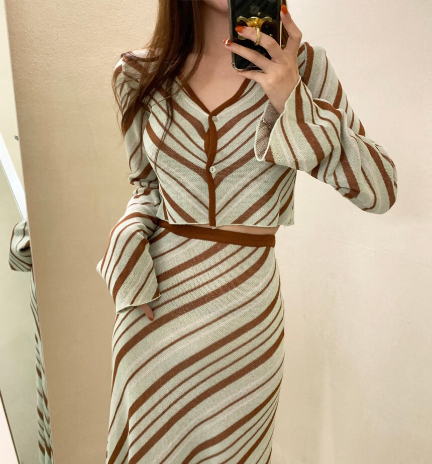 SALE 送料無料 ◆ D1311 バイアス ストライプ ショート トップス & スカート ニット セットアップ ワンピース《ミント×ブラウン》マルチストライプ ナナメ 茶 チョコミント 上下セット 2点セット セットコーデ ツーピース インポートセットアップ パーティードレス ボーダー 上下 ニット フレアスカート メール便 Vネック 2点 パーティーワンピ お食事 ひざ丈 おしゃれ 袖あり インポートワンピース 水色 ライトブルー オフィスカジュアル カジュアルコーデ 衣装