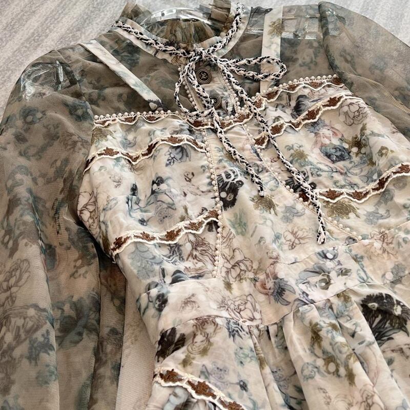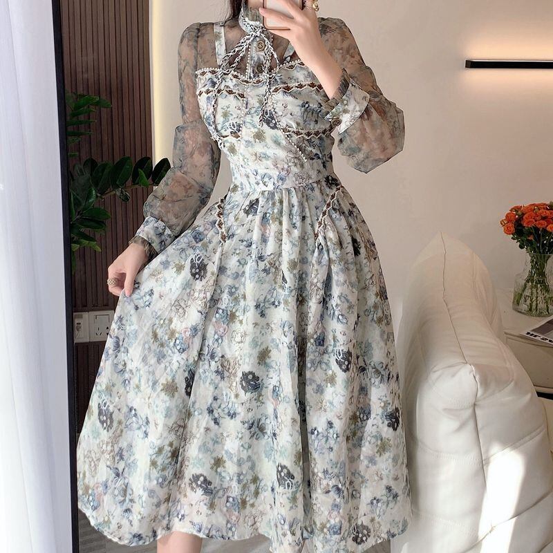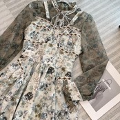 送料無料 ◆ D1336 ネックリボン パール アンティークゴールドボタン レーススリーブ ドール柄 切替 ワンピース《フレンチグレー》袖あり 長袖 ライトグレー ブルーグレー ホワイト 柄物 無地 インポートワンピース ワンピース パーティードレス メール便 パーティーワンピ 袖付き お呼ばれワンピース ミディ お呼ばれ 謝恩会 同窓会 パーティー ひざ丈 長袖 おしゃれ インポートワンピース お呼ばれ お出かけ 衣装 ドール ビスチェ風 レイヤード風 クラシックワンピース レースワンピ