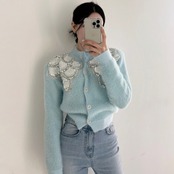 送料無料 ◆ D1340 パール ラインストーン スパンコール ビーズ ビジューボタン 前開き モヘア ニット カーディガン《ライトブルー/ホワイト》水色 白 ニット シャギーニット モヘアニット カーデ ニットトップス ニットカーデ ビジュー付き パール付きニット スパンコール付きニット ふわふわ モコモコ ビーズ刺繍 柔らか 暖か ふんわり やわらか