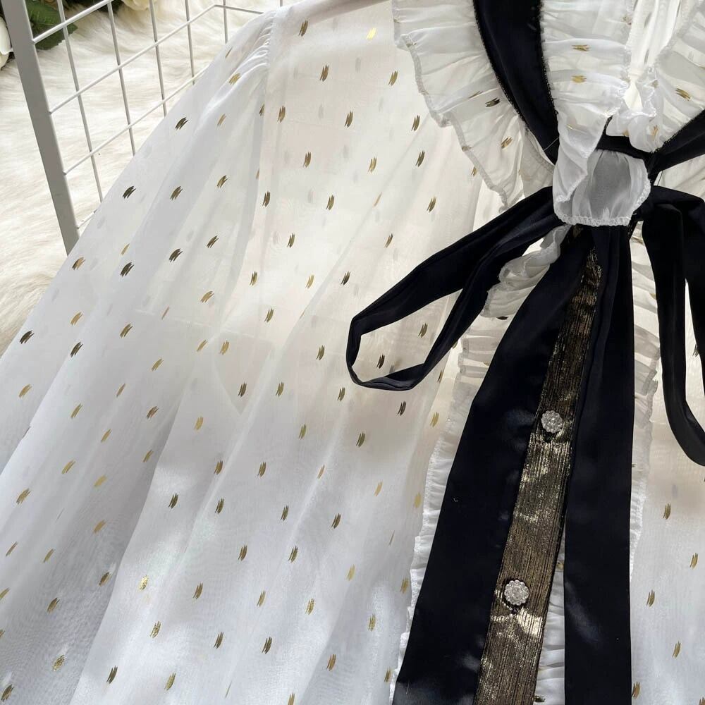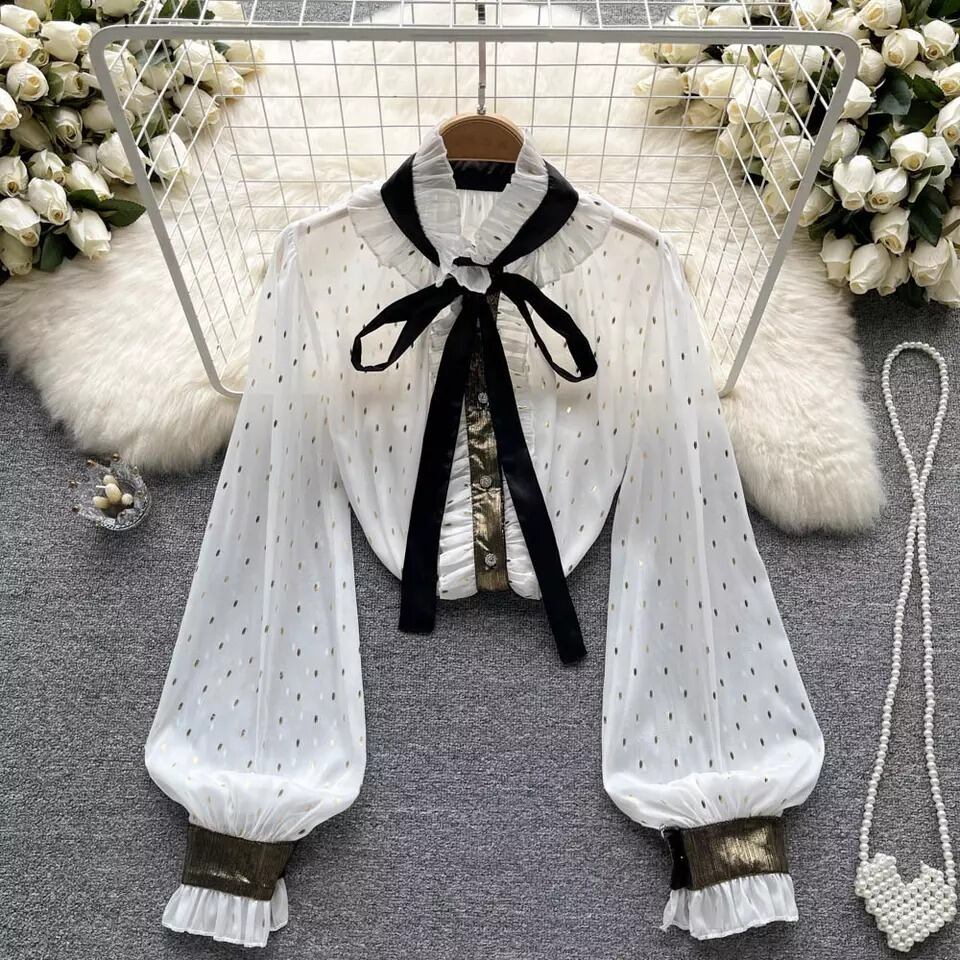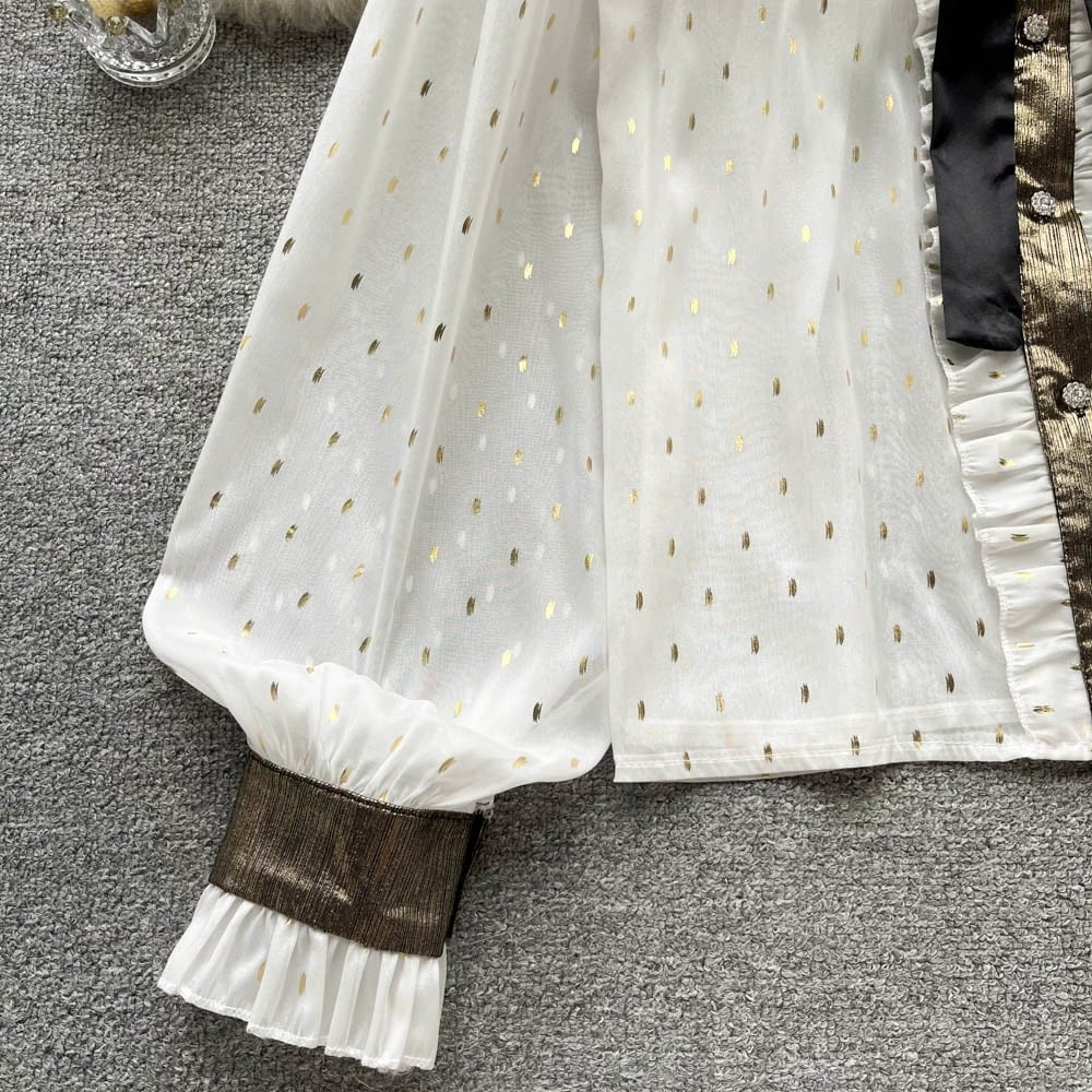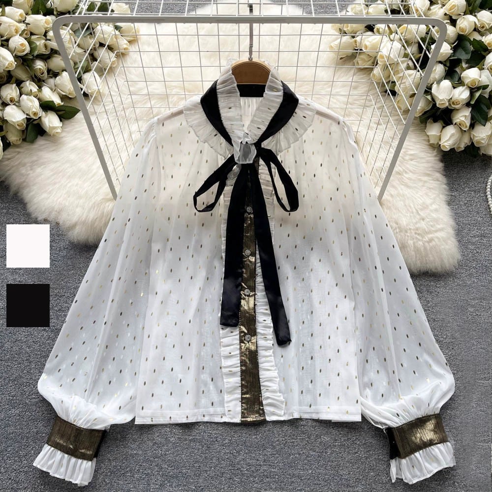 送料無料 ◆ D1371 ブラック ボウタイ リボン スタンドフリル ゴールド カフス ビジューボタン ドレスシャツ ブラウス《 ホワイト/ブラック》白 金 ブロンズ アンティークゴールド 長袖 袖あり 水玉 クラシック クラシカル ヴィンテージ風 黒リボン インポートシャツ ドレスシャツ ドレスブラウス 衣装 メール便 袖付き お食事 おしゃれ 無地 袖あり 光沢 お呼ばれ 結婚式 箔押し お出かけ 上品 パーティー 卒業パーティー クリスマス 謝恩会 発表会 同窓会