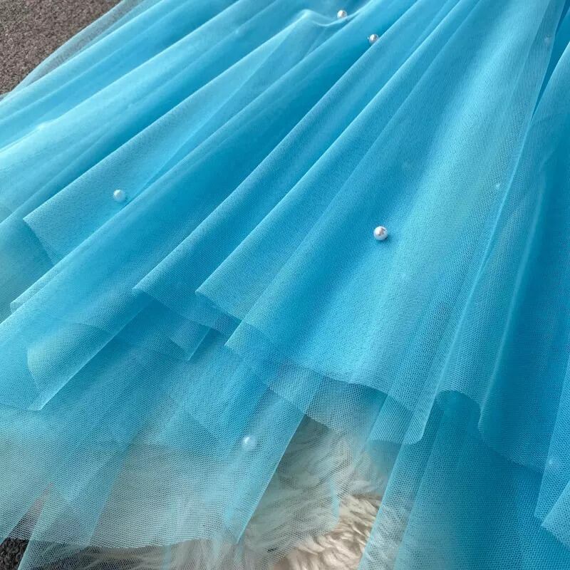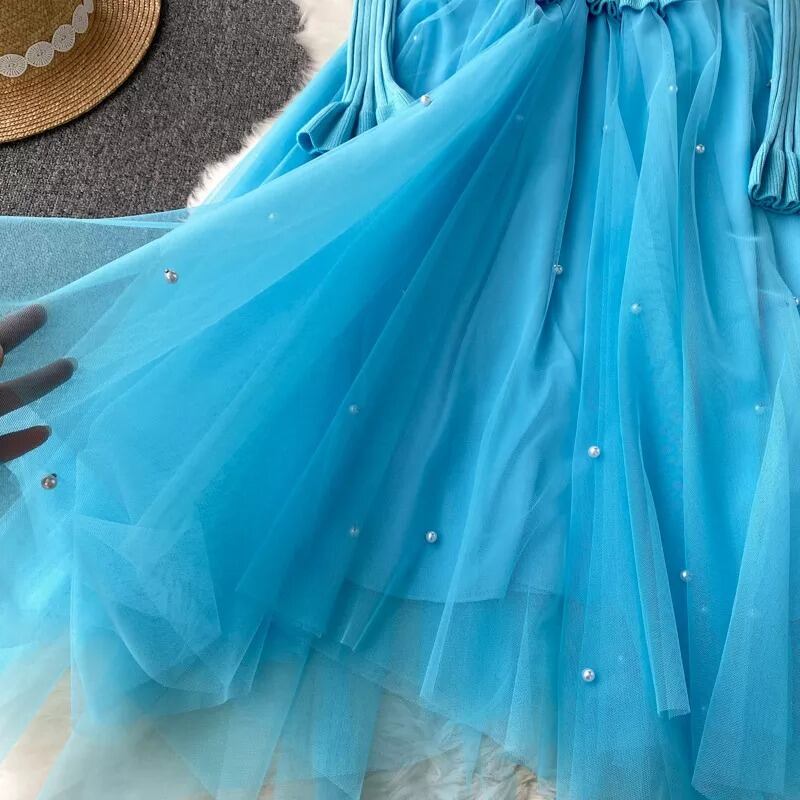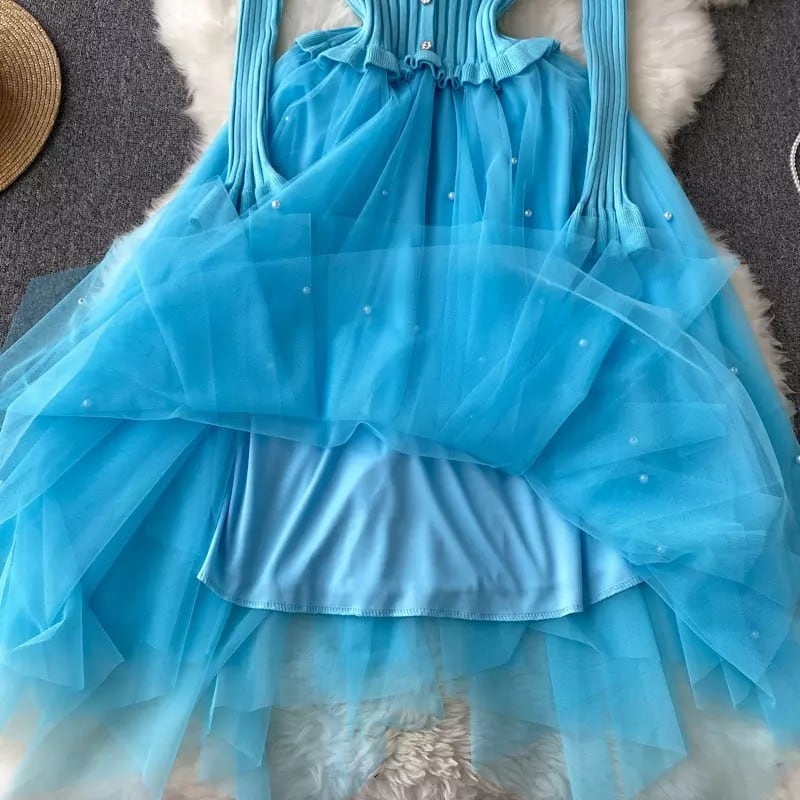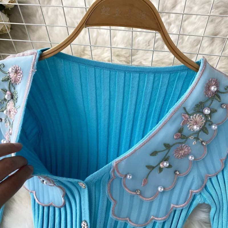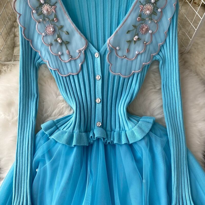 SALE 送料無料 ◆D1376 花刺繍 パール 襟つき ニット × パール チュール 切替 ワンピース《 スカイブルー 》チュール 切替 長袖 異素材 コンビ素材 ニットワンピース ニットワンピース 長袖 無地 水色ニットワンピース 水色 ライトブルー ベルスリーブ インポート パーティードレス カジュアル パーティーワンピ カジュアル お食事 おしゃれ 袖あり ロングワンピース 膝下 秋冬 ふわふわ インポートワンピース 衣装 同窓会 謝恩会 卒業パーテイー クリスマス