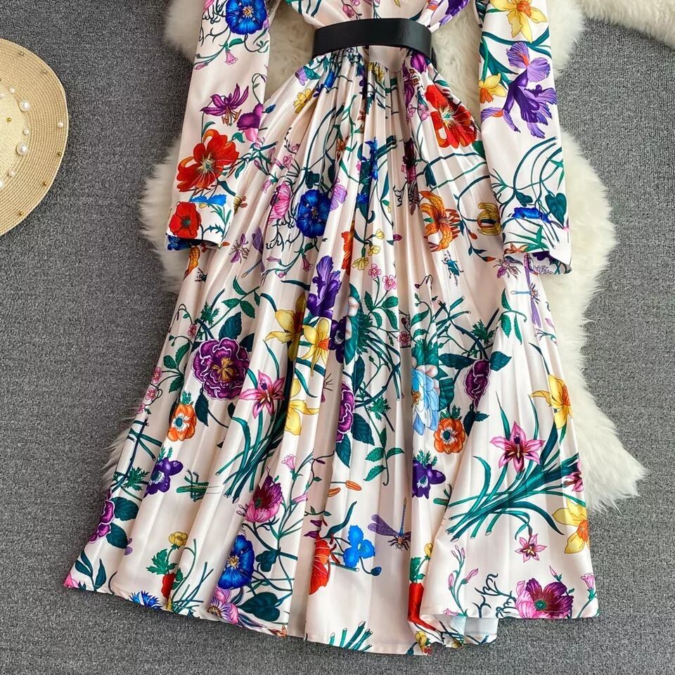 送料無料 ◆ D1392 ブラックベルト付き 襟付き カラフル ボタニカル フラワー 長袖 プリーツ ワンピース《 オフホワイト×マルチカラー 》白 カラフル 前開き ウエストベルト 長袖 シャツワンピース 膝下 ミモレ フラワー シャツワンピース インポート パーティードレス カジュアル 華やか 上品 メール便 パーティーワンピ お呼ばれワンピース お食事 ひざ丈 おしゃれ クラシカル マルチカラー カラフル 袖あり インポートワンピース 衣装 発表会 謝恩会 同窓会
