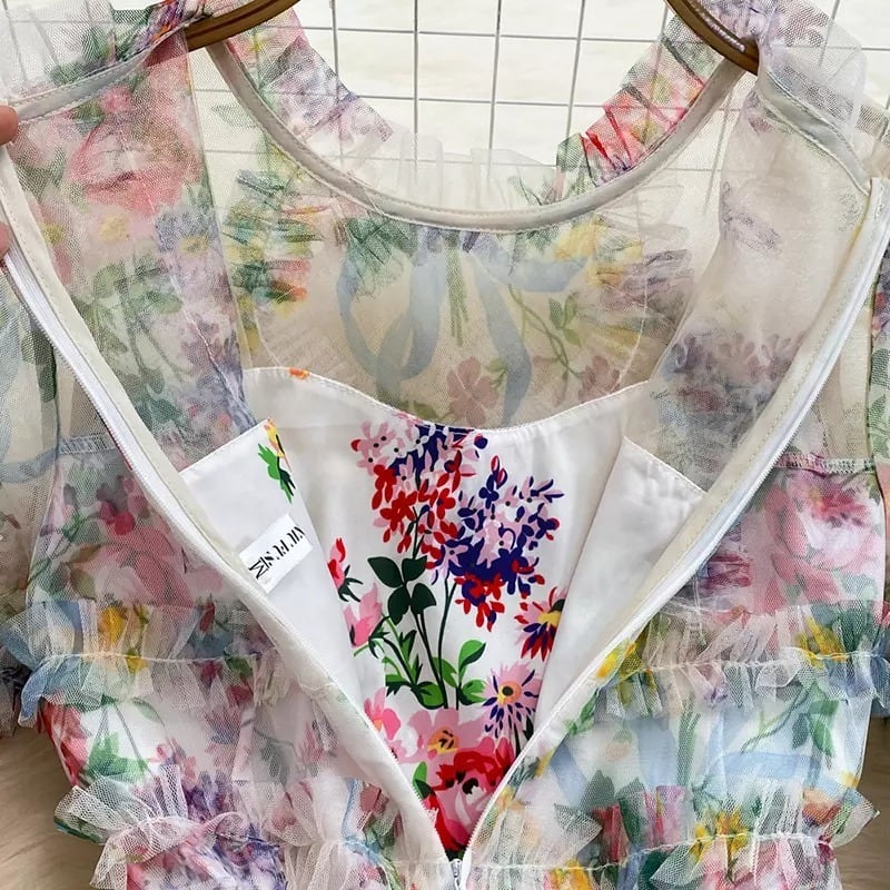 淡いフラワープリントのチュール生地が重なった華やかな1着