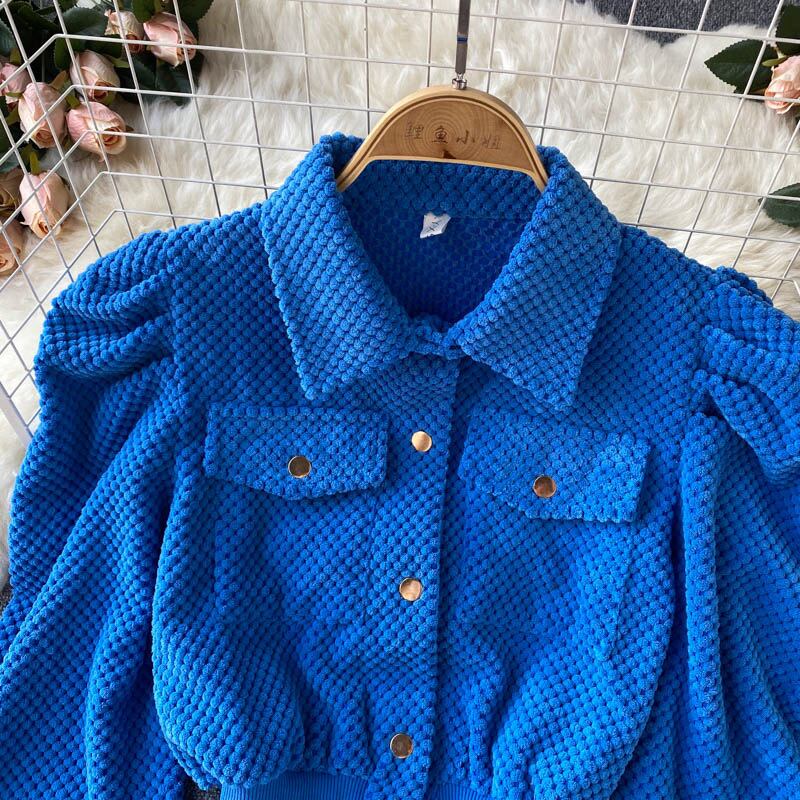 送料無料 ◆ D1438 襟付き ゴールド スナップボタン 前開き パワーショルダー モコモコ トップス《 ブルー 》トップス ライトアウター 長袖 ベロア 無地 ブルートップス 白トップス ホワイトトップス カラーシャツ パワーショルダー バルーンスリーブ インポート パーティードレス ビタミンカラー 青 メール便 袖あり 前開き トップス リブ