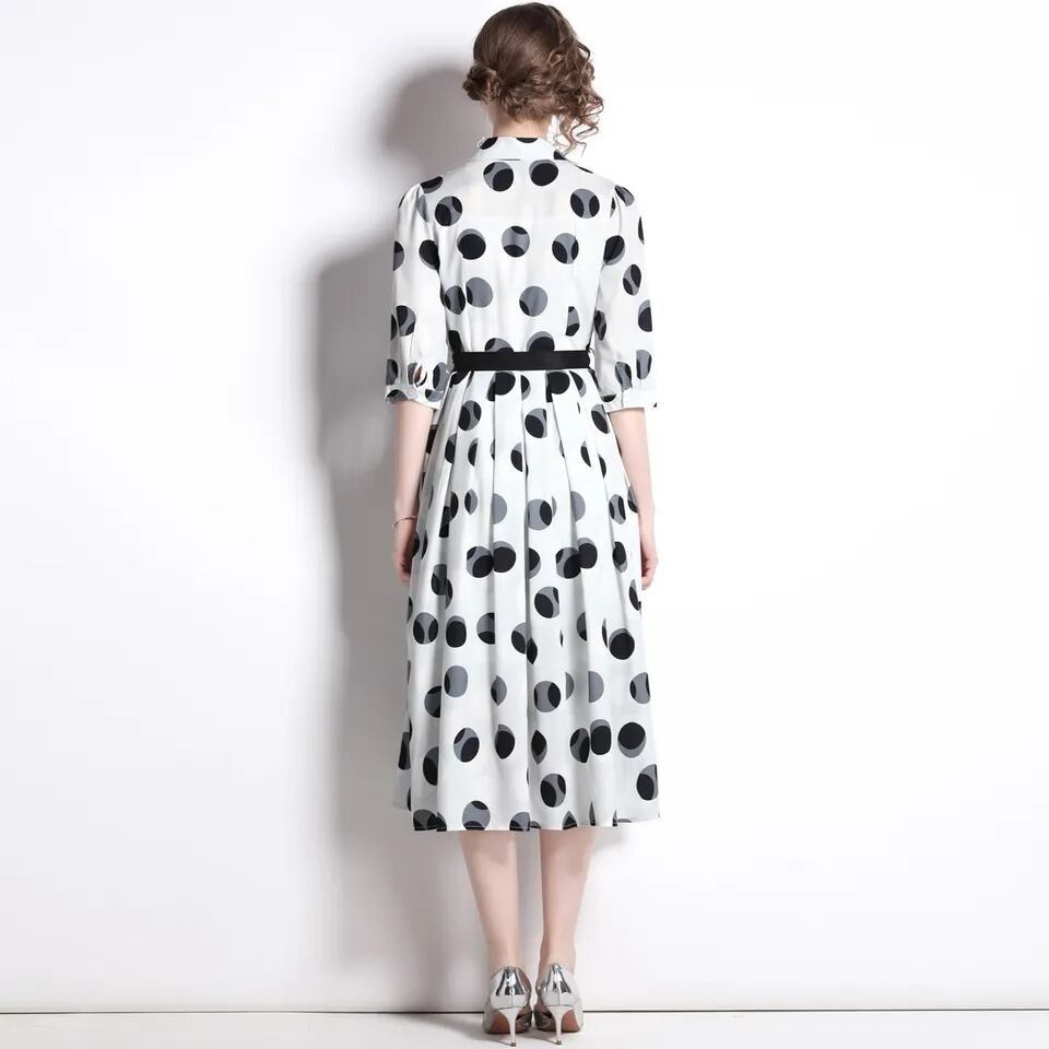 送料無料 ◆ D1484 ブラックリボン付き 襟付き 7分袖 ドット プリーツ ワンピース 《アイスグレー ×ブラック 》 水玉 白黒 モノトーン シャツワンピース シャツワンピ ミモレ 柄ワンピース クラシカル パーティードレス お呼ばれ 柄物ワンピース 柄ワンピ メール便 パーティーワンピ 袖付き お呼ばれワンピース ロング 衣装 インポートワンピース オフィスカジュアル お呼ばれ お出かけ 同窓会 謝恩会 発表会 卒業パーティー