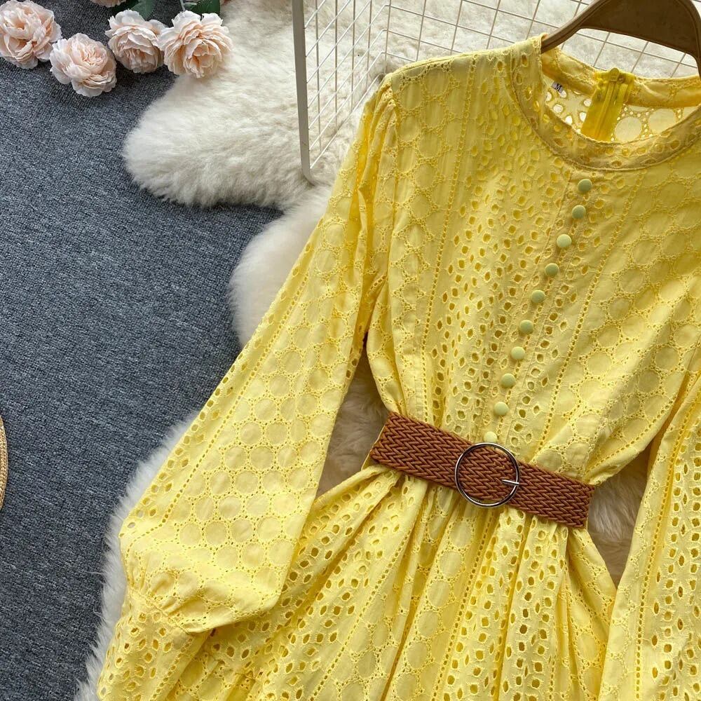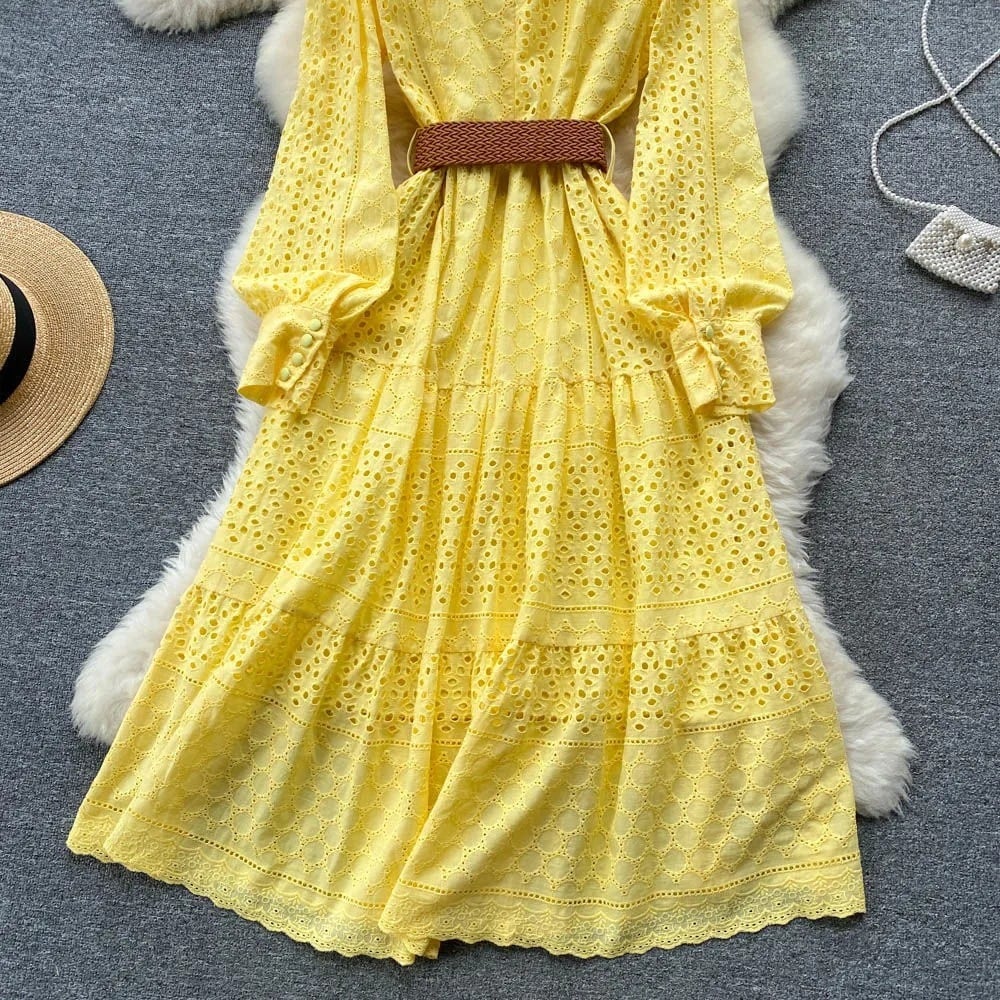 送料無料 ◆ D1493 ブラウンベルト付き 胡桃ボタン 長袖 カットワーク レース ワンピース《 イエロー》無地 クラシカル 袖あり シャツワンピース 黄色ワンピ イエローワンピース 黄色ワンピース 同窓会 謝恩会 ワンピース インポート パーティードレス 緑ワンピ 緑ワンピース メール便 パーティーワンピ おでかけ お食事 膝下 おしゃれ 袖あり インポートワンピース パーティードレス ロングワンピース 衣装 ベルトセット ベルト付き 2点セット レースワンピ 黄色