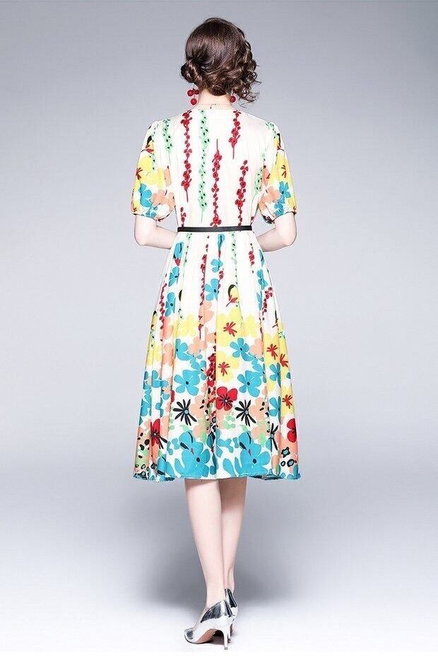 送料無料 ◆ D1527 ブラックベルト付き カラフル フラワー Vネック パフスリーブ フレア ワンピース《 ホワイト×カラフル 》白 カラフル ベルト付き ベルトセット ウエストベルト 膝丈 膝下 ミモレ フラワー インポート パーティードレス カジュアル 華やか 上品 メール便 パーティーワンピ お呼ばれワンピース お食事 ひざ丈 おしゃれ 上品 マルチカラー カラフル 袖あり インポートワンピース