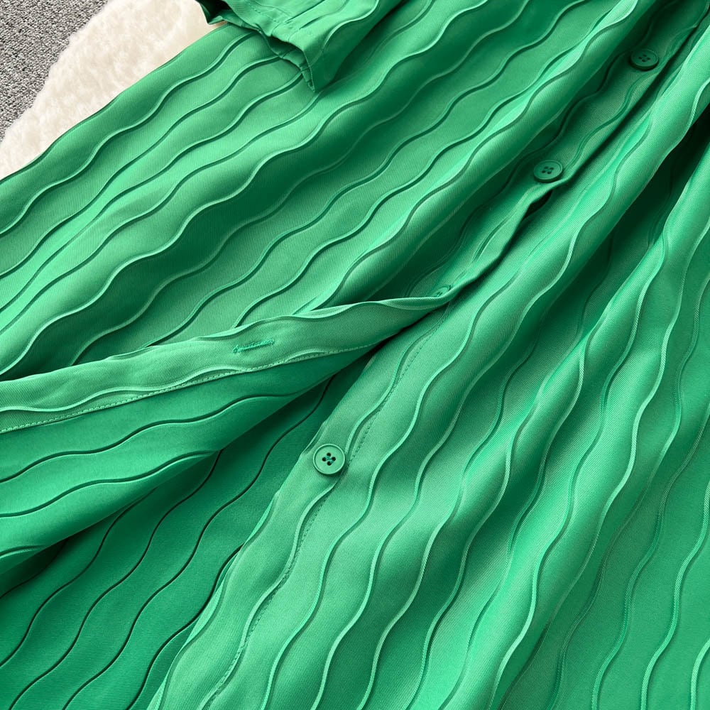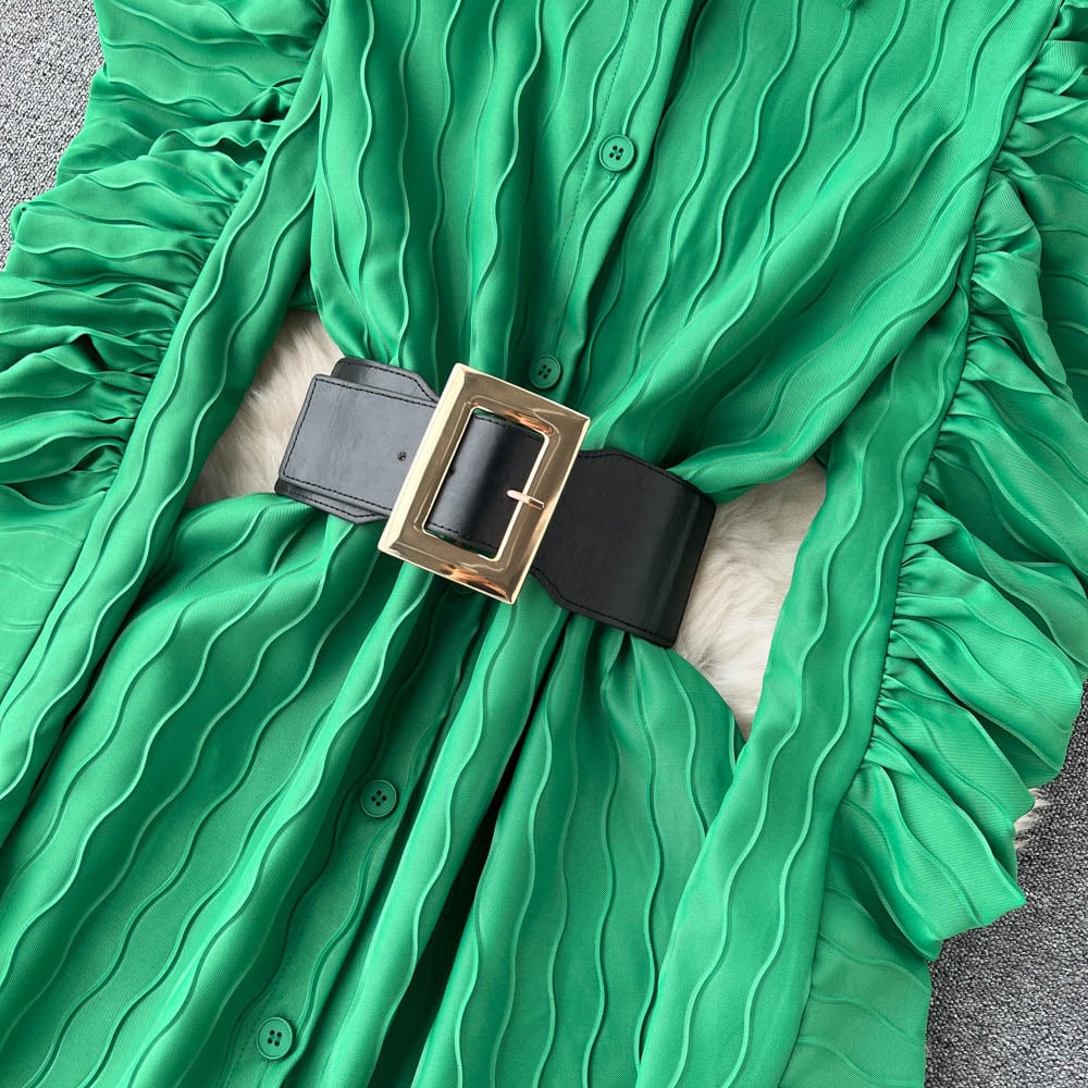 《訳ありアウトレット》送料無料 ◆ D1338 ワイドベルト付き 前開き 襟付き パワーショルダー ナミナミ ロング ワンピース 《グリーン・ホワイト》白 緑 ベルトセット 2点セット シャツワンピース バルーンスリーブ シャーリングスリーブ ギャザースリーブ パワショル 太ベルト 衣装 80s 透けない カジュアルコーデ おしゃれ ファッション モード モード系 白ワンピ 訳あり わけあり ワケあり B品 SALE セール