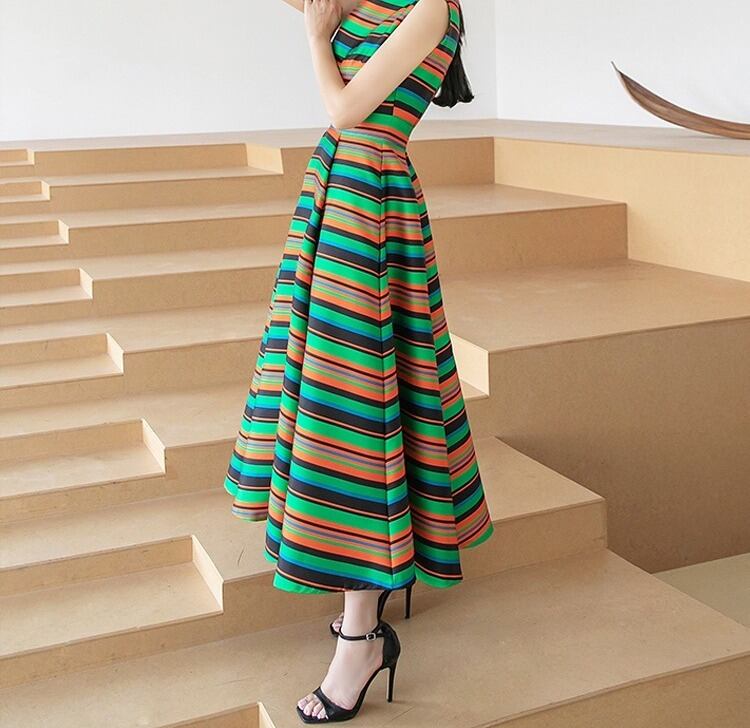 送料無料 ◆ D1583 マルチボーダー ノースリーブ フレア ロング ドレス ワンピース 《グリーン×オレンジ》 グリーン 鮮やか ツヤ ブラック ブルー ボーダー マルチストライプ ストライプ フォーマル 華やか ワンピース 膝丈 膝下 ミモレ マキシ ロング 柄物 ウエディング メール便 エレガント パーティー お出かけ 上品 衣装 パーティードレス 発表会 結婚式 ガーデン セミフォーマル プリンセスライン