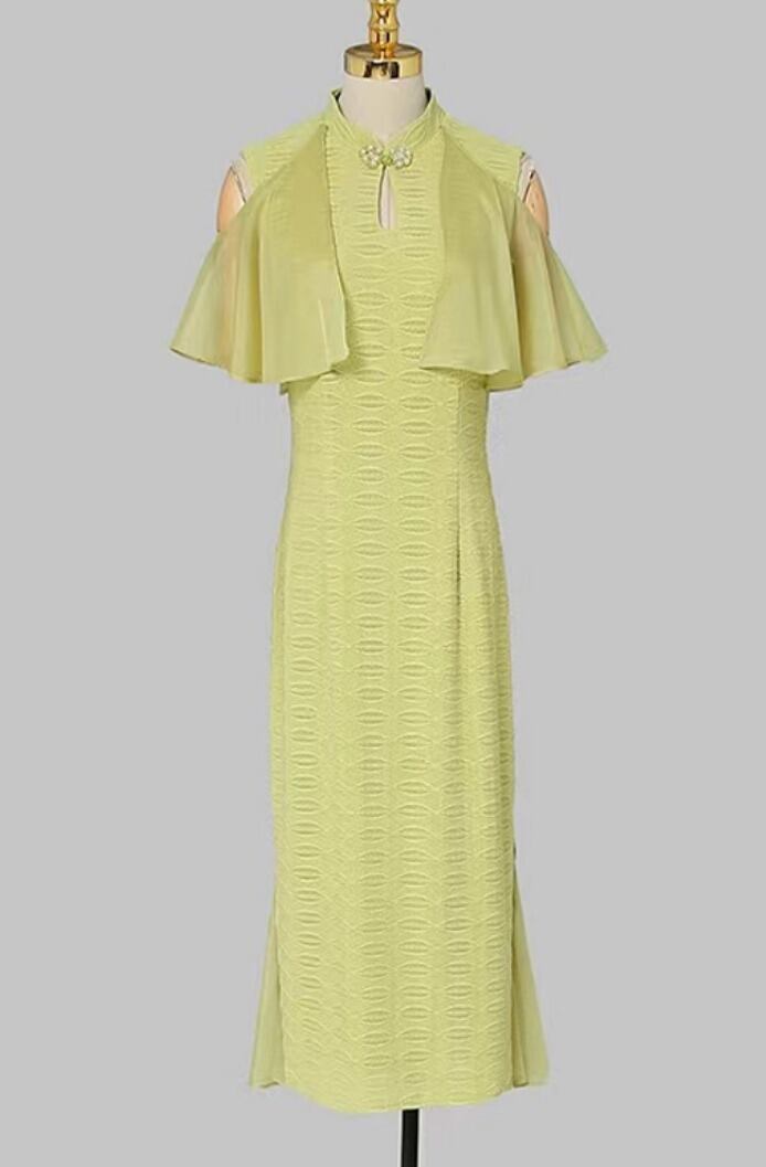 送料無料 ◆ D1585 パール チャイナボタン オープンショルダー フレアスリーブ ワンピース《 ライムイエロー 》ロングスリーブ 無地 グリーン ミント ライトグリーン 総レースワンピース 膝丈 膝下 ミモレ ミディ 他と被らない 透けない メール便 パーティーワンピ お呼ばれワンピース お食事 ひざ丈 お呼ばれ 結婚式 お呼ばれ おしゃれ 袖あり インポートワンピース 黄緑 黄緑ワンピース 緑ワンピース