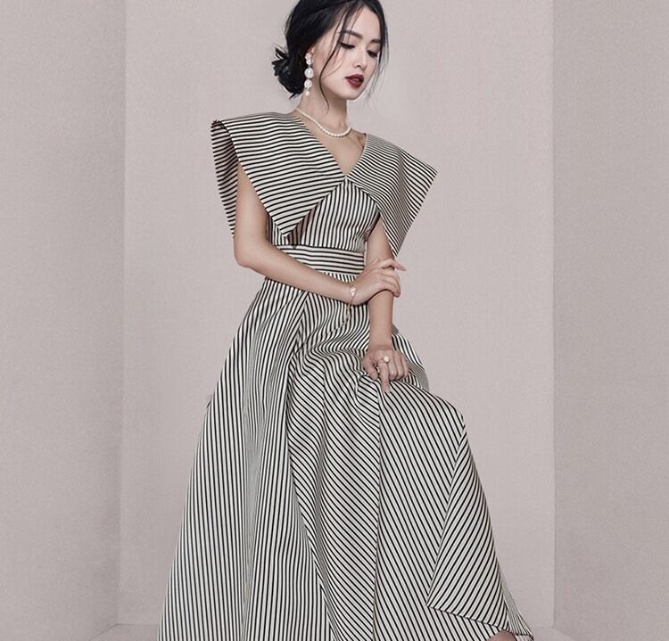 送料無料 ◆ D1586 ビックカラー Vネック ストライプ クラシカル ロング ワンピース 《ホワイト×ブラック 》レース インポート パーティードレス クラシック ロングワンピ ミディ 膝下 メール便 パーティーワンピ お呼ばれワンピース お食事 ひざ丈 おしゃれ 袖あり インポートワンピース ロングワンピース 上品 お出かけ 衣装 ブラック ホワイト パール付き 爽やか