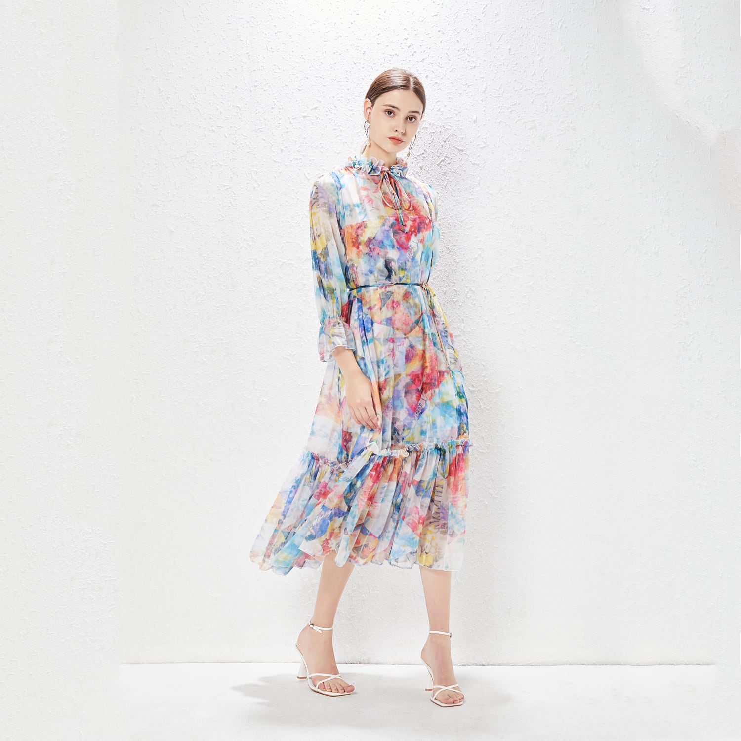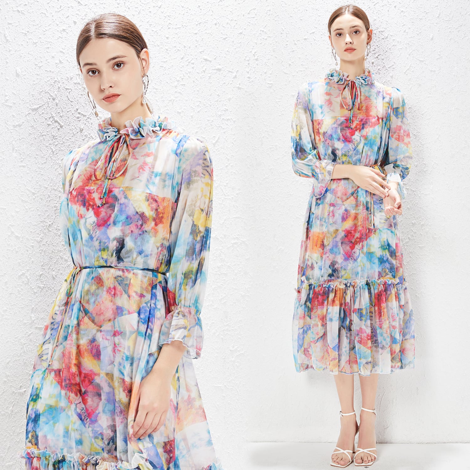 送料無料 ◆ D1593 ペチコート&リボン 付き マーブル キャンディースリーブ シア ング ワンピース《 ブルーミックス 》マーブルカラー カラフル ブルー 水色 青 赤 長袖 ドレス ピンクワンピース シフォン リボン フレア プリーツ ベルト 膝下 ミモレ ロング 袖あり パーティードレス 衣装 同窓会 謝恩会 発表会 インポートワンピース
