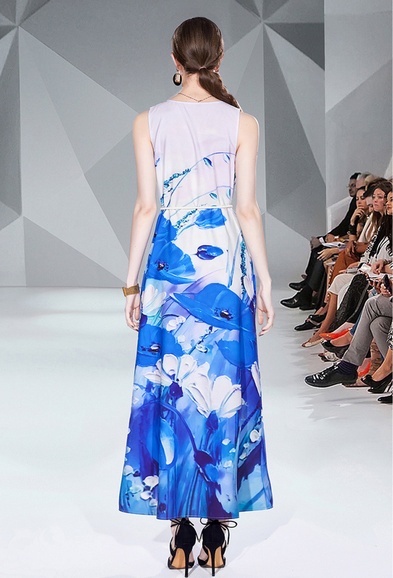 青い花柄のノースリーブワンピース
