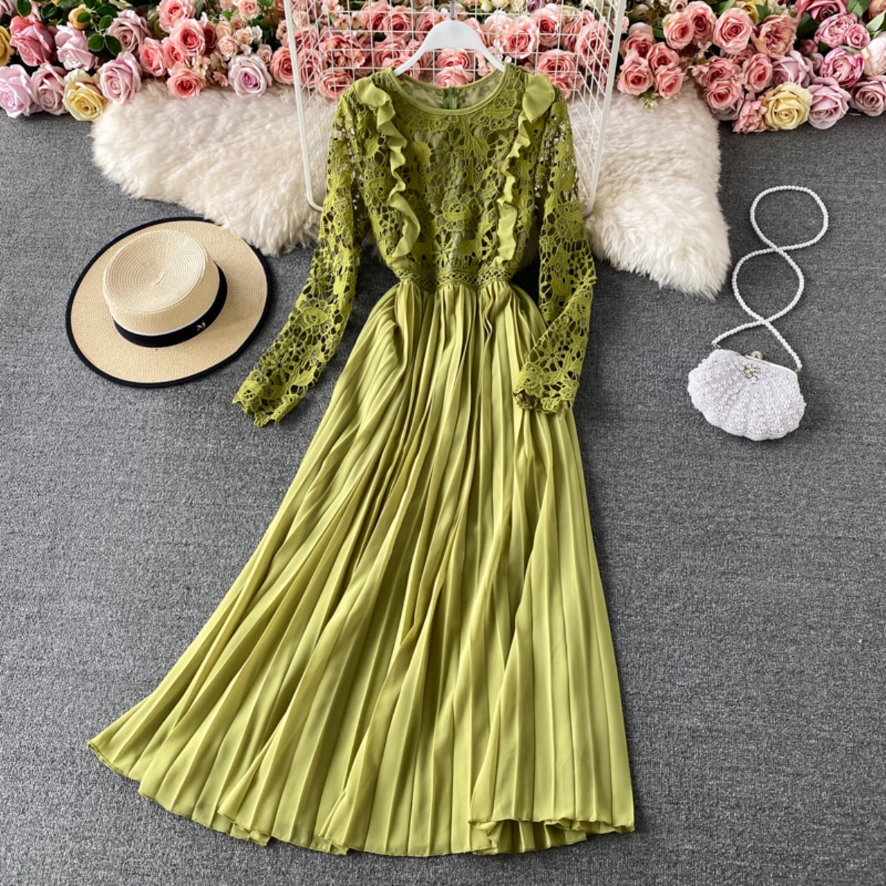 《訳ありアウトレット》送料無料 ◆ D716 クロッシェレース × シフォン プリーツ ロング ワンピース 《ライトグリーン・イエロー》フリル 黄色 黄緑 グリーン 長袖 ロングスリーブ レースワンピース コンビワンピース 切替ワンピース 異素材ミックス ロングワンピース パーティードレス イエロー マスタード 袖あり お呼ばれドレス レースワンピース レースドレス 上品 長袖 袖あり 総レース ミモレ マキシ ロング 女子会 パーティー ドレス結婚式 お呼ばれ B品 訳あり 訳あり品 訳あり商品