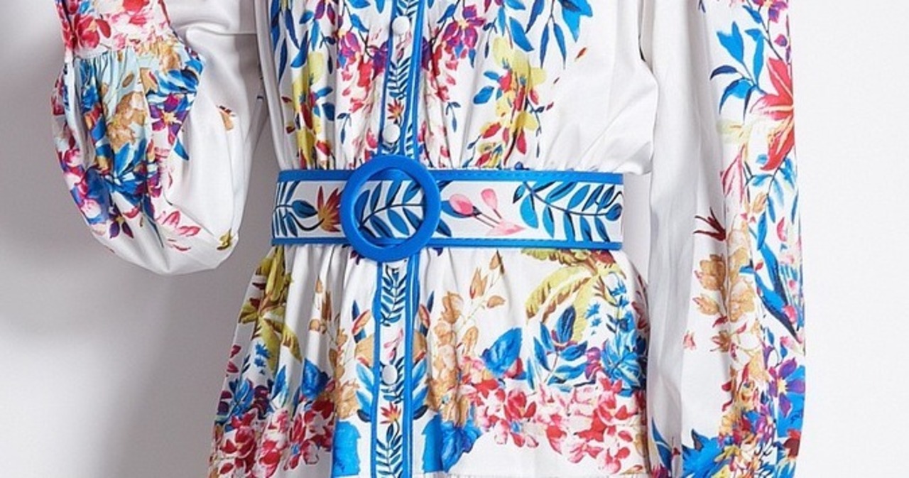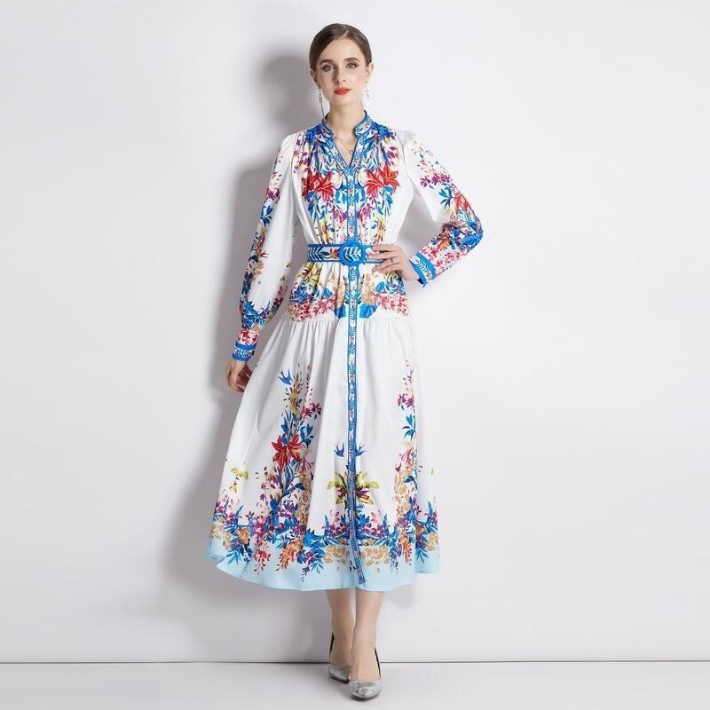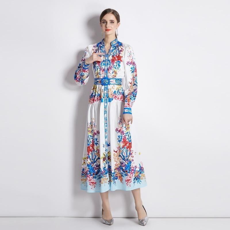 送料無料 ◆ D1684 ブルーライン フラワーベルト付 花柄 前開き ロング バルーンスリーブ ワンピース《ホワイト×ブルー 》カラフル レッド ミックス マルチカラー 白 マキシ ベルト付き ウエストベルト ウエストゴム シャツワンピース 膝下 ミモレ フラワー インポート パーティードレス カジュアル 華やか 上品 メール便 パーティーワンピ お呼ばれワンピース お食事 マキシワンピース おしゃれ 上品 衣装 袖あり インポートワンピース フラワー