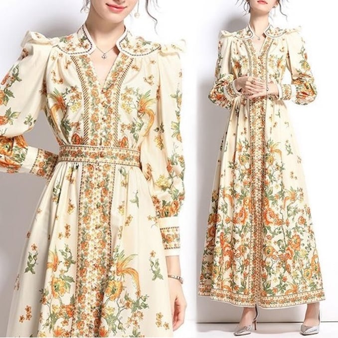 送料無料 ◆ D1694 オレンジ フラワー ストライプライン 長袖 胡桃ボタン 前開き マキシ ワンピース《オレンジ》 フラワー 花柄 フロアレングス フロア丈 小花柄 袖あり グリーン 花柄ワンピース 膝丈 膝下 ミモレ ミディ ロング 袖あり ロングワンピース エレガント 華やか パーティー 上品 シャツワンピース 長袖 花柄ドレス