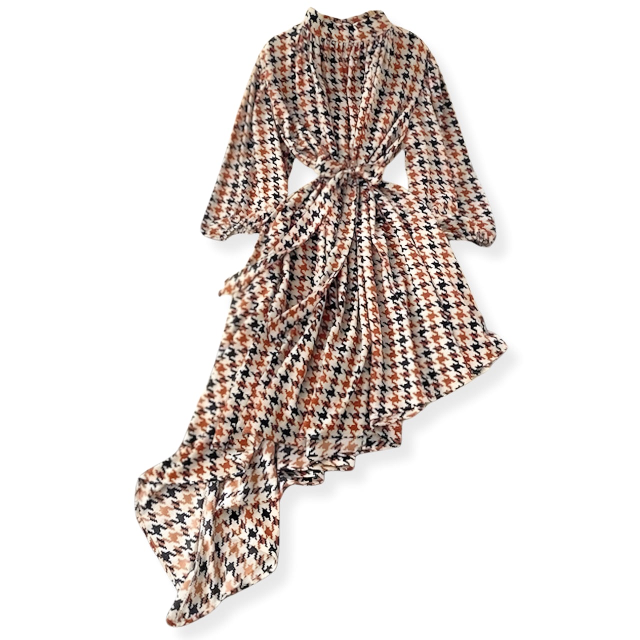 送料無料 ◆ D1704 ウエストリボン付き アシンメトリー スタンドネック ガンクラブチェック ワンピース《ベージュ》アシメ リボン付き ウエスト紐 ブルー 千鳥格子 チェックトップス ブラウス ロングブラウス ミニワンピース ブラックブラウス モード ファッション グリーンブラウス シャツ フリルブラウス 無地 トップス フリル袖 インポート カジュアル メール便 カジュアル モード おしゃれ お出かけ お呼ばれ 衣装 アシメブラウス《唯月ふうかさんご着用》