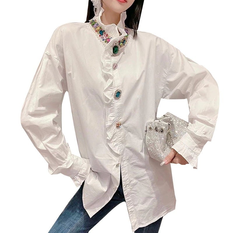 送料無料 ◆ D1713 カラフル ストーン ビジュー パール ボタン ロング ドレスシャツ ブラウス 《ホワイト》白ブラウス 白シャツ 色々ボタン フリルブラウス ロングシャツ ロングスリーブ 袖あり 無地 パワースリーブ ラッフル シャツ フォーマル 白シャツ セミフォーマル トップス 前開き 前ボタン フリル袖 インポート パーティードレス カジュアル メール便 カジュアル モード おしゃれ お出かけ お呼ばれ