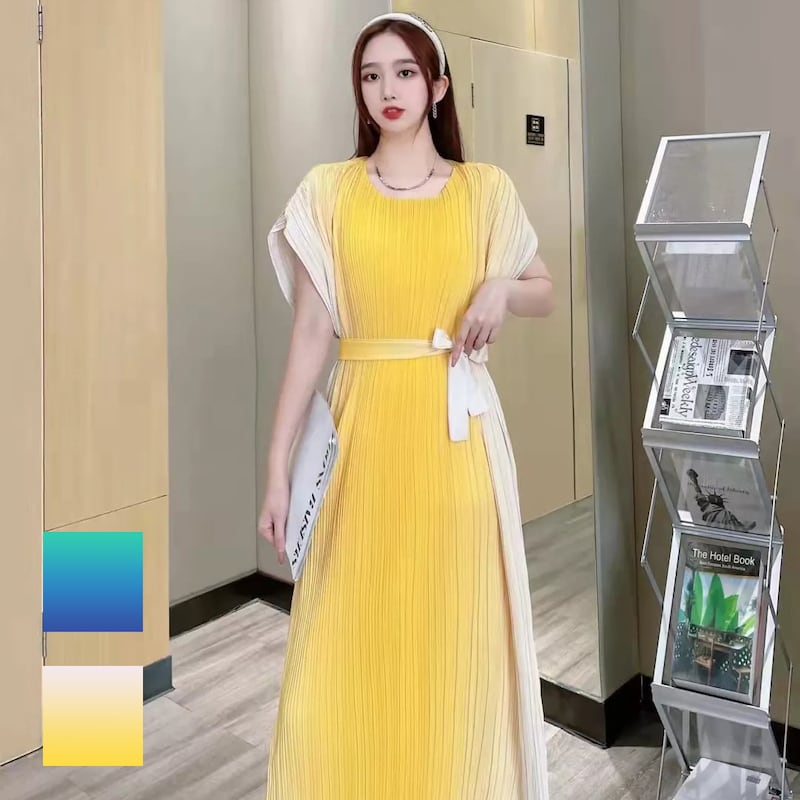 《訳ありアウトレット》送料無料 ◆ D978 リボン付き グラデーション ラグラン フレンチスリーブ プリーツ ワンピース《 グリーン / イエロー》プリーツワンピース アコーディオンプリーツ ノースリーブ 黄色 イエロー グリーン ブルー グラデ 黄色ワンピース ノースリーブワンピース パーティードレス 膝丈 パーティー フリル リボン ロング お呼ばれ おでかけ 黄緑 パーティーコーデ カジュアル おでかけ 華やか フリフリ フリルスリーブ 2次会 衣装 サマードレス 訳あり SALE B品