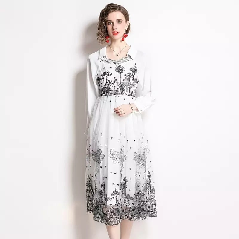 《訳ありアウトレット》送料無料 ◆ D1407 ブラック ボタニカル 刺繍 襟付き 長袖 モノトーン クラシカル ワンピース《 ホワイト×ブラック》白ワンピース 長袖 花刺繍 黒 ワンピース セミラグランスリーブ ラグランスリーブ モノトーン 柄物 無地 白黒 インポートワンピース ワンピース パーティードレス メール便 パーティーワンピ 袖付き お呼ばれワンピース ひざ丈 長袖 おしゃれ インポートワンピース お呼ばれ お出かけ 上品 結婚式 ロングワンピース 衣装 わけあり B品 SALE