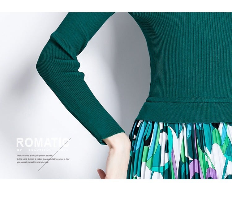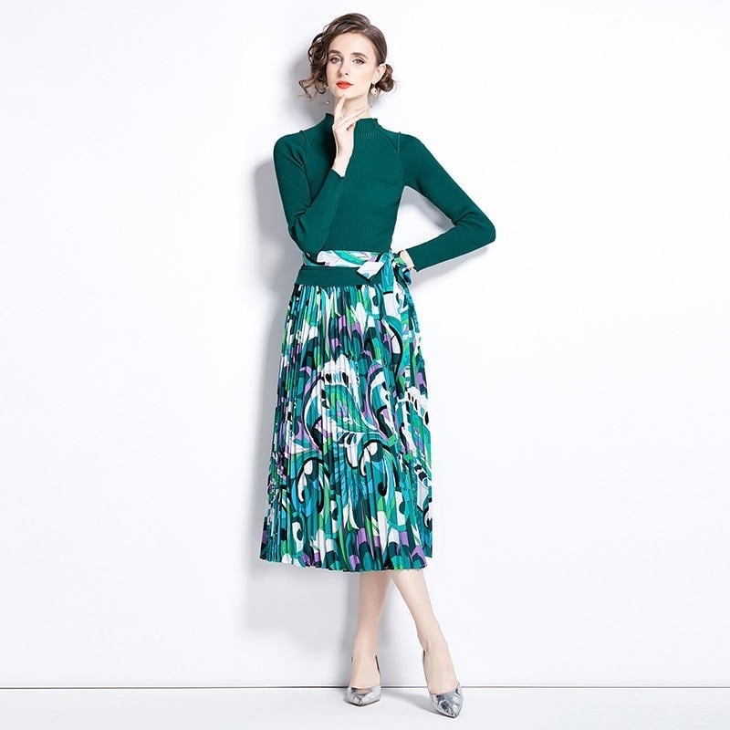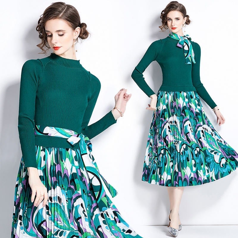 送料無料 ◆ D1718 スカーフベルト付き ニット × ジオメトリック プリーツ 切替 ロング ワンピース《 グリーン 》3点セット ベルトセット スカーフセット 幾何学柄 ドッキングワンピース 異素材 ミックス 切替 コンビ素材 ニットワンピース ニットワンピース 長袖 グリーンニットワンピース インポート パーティードレス カジュアル 上品 パーティーワンピ お呼ばれワンピース お食事 ひざ丈 おしゃれ 袖あり ロングワンピース 長袖 膝下 秋冬 インポートワンピース