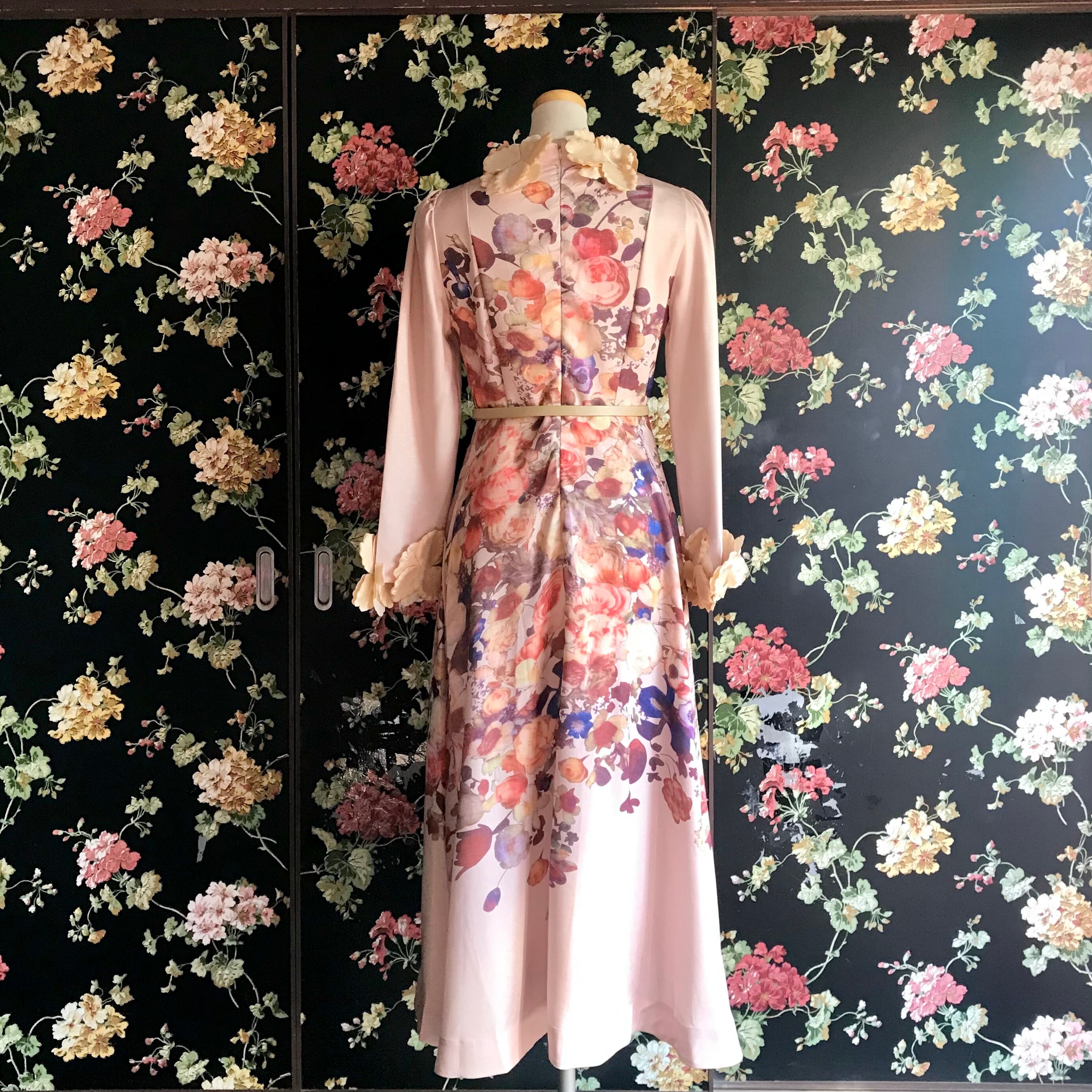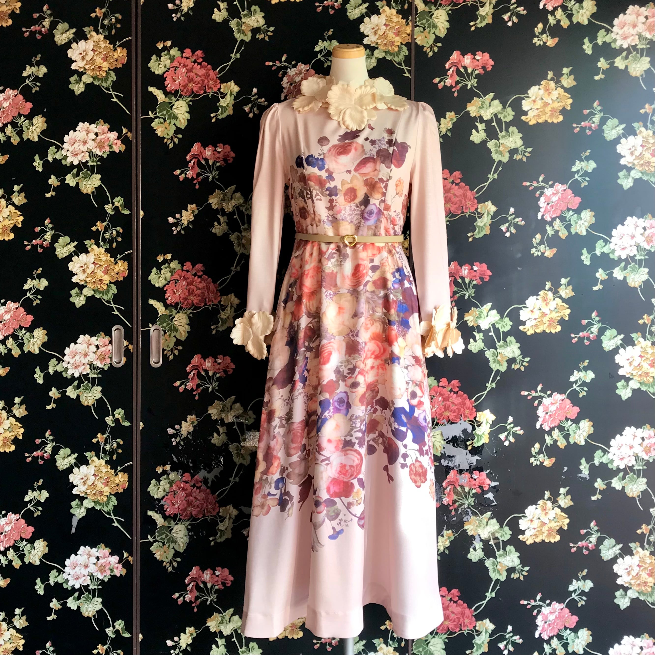 送料無料 ◆ D1720 ベージュ ベルト付き 立体フラワーモチーフ クラシカルフラワー ロングワンピース《 ライトベージュ 》セピア ライトベージュ ベージュ オフホワイト 長袖 ドレス リボン フレア ベルト 膝下 ミモレ ロング 袖あり パーティードレス 衣装 同窓会 謝恩会 発表会 クリスマス インポートワンピース パーティー