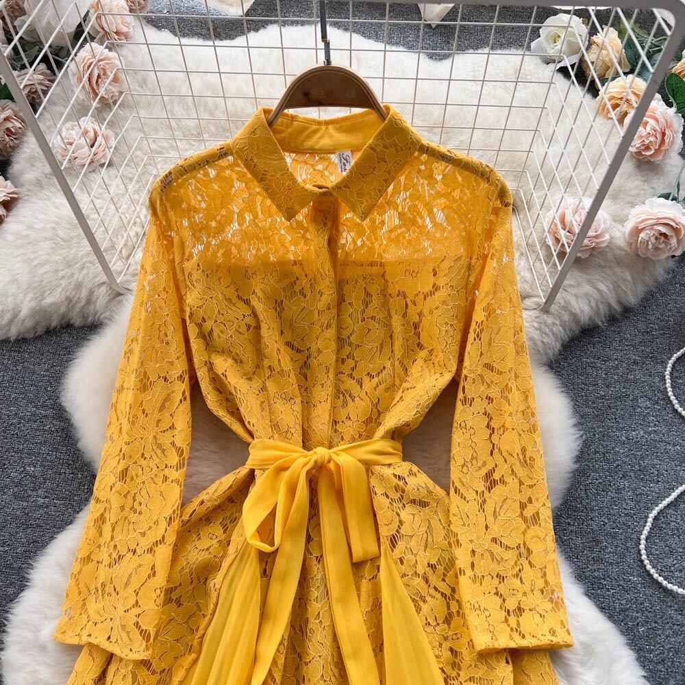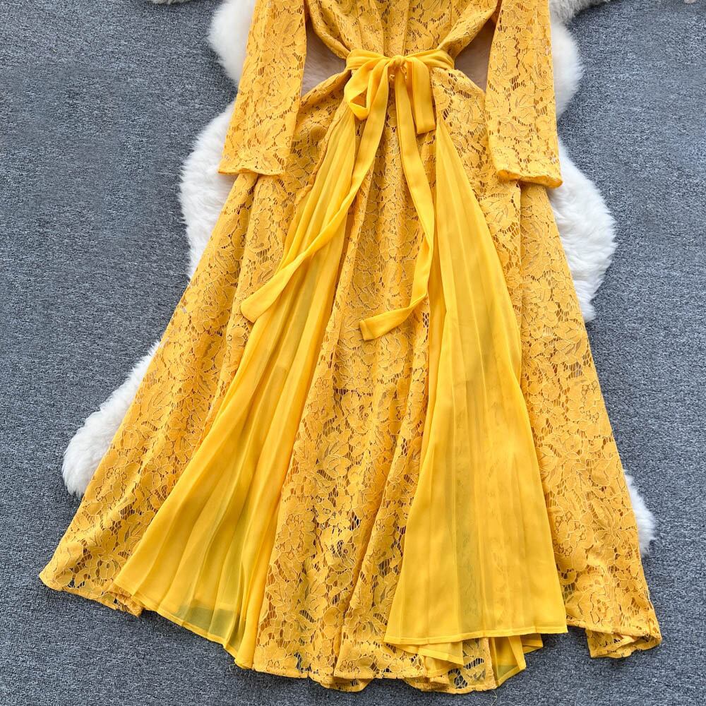 送料無料 ◆ D1758 リボン付き 襟付き レース 比翼仕立て プリーツ 切替 ロング ワンピース《 イエロー 》黄色 パーティードレス 無地 クラシカルワンピース クラシック イエローワンピース ロングタイ リボンタイ レースワンピース 上品 長袖 パフスリーブ バルーンスリーブ 袖あり 総レース ミモレ マキシ ロング 膝下丈 女子会 パーティー ドレス ストライプ 結婚式 お呼ばれ 衣装 上品 清楚 お出かけ お食事 同窓会 発表会 卒業パーティー 謝恩会 同窓会