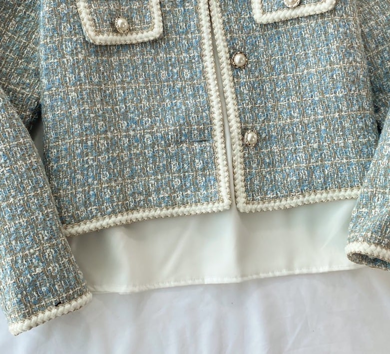 送料無料 ◆ D1760 パールボタン ホワイト×ゴールドパイピング ミックスツイード ジャケット & ミニ スカート セットアップ スーツ《 ライトブルー×ホワイト 》スーツ 上下セット 2点セット ツーピース 上下 水色 キャメル 白 ジャケット トップス スカート タイトスカート セット 無地 膝下 アンクル丈 タイト クラシカル パーティードレス 袖付き お食事 袖あり オフィスカジュアル お呼ばれ お出かけ上品 インポートセットアップ 衣装 エレガント スカートセット ジャケットセット