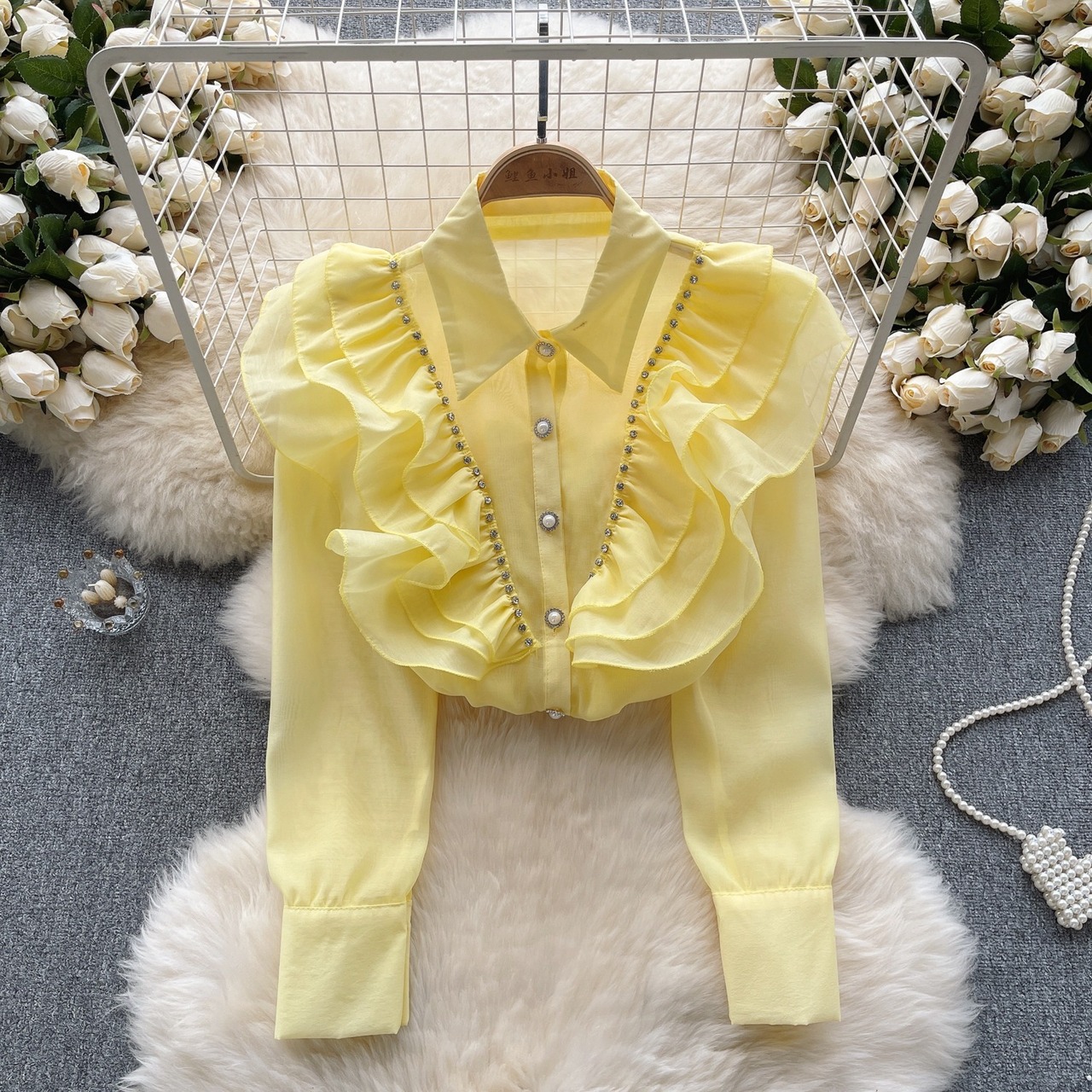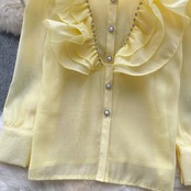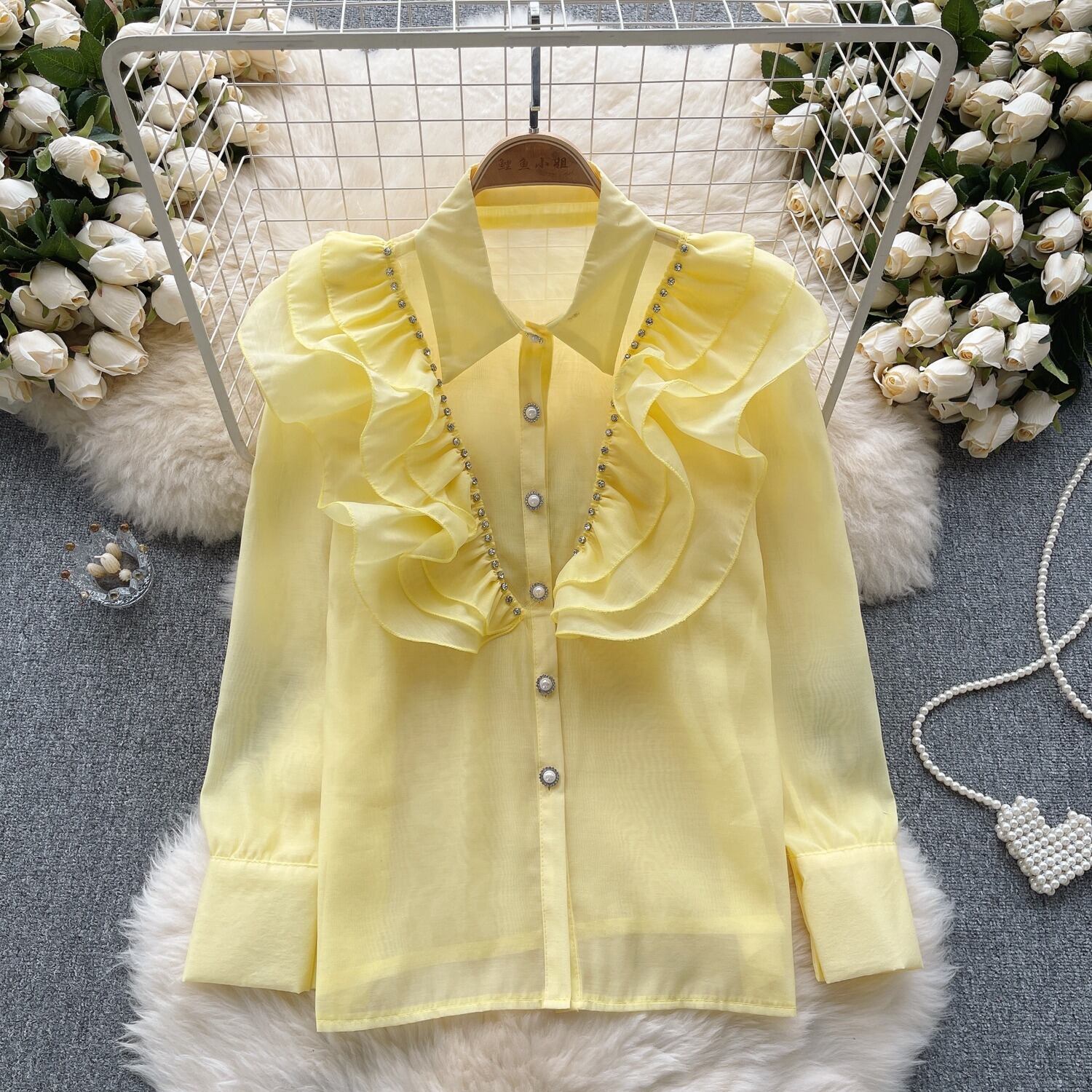 送料無料 ◆ D1762 襟付き シルバー ビジュー パールボタン フリル 前開き シアー ブラウス 《イエロー》黄色ブラウス 黄色シャツ イエローブラウス 光沢 シャツ ドレスブラウス カラーシャツ 襟付きブラウス ラインストーン 無地 バルーンスリーブ ランタンスリーブ インポート パーティードレス ビタミンカラー キャンディーカラー メール便 袖あり カジュアル トップス 前開き パール ストーン シルバー パーティートップス パーティー
