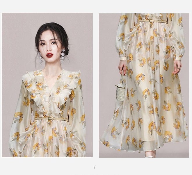 送料無料 ◆ D1766 ベルト付き イエロー フラワー Vネック フリル 長袖 ロング ワンピース《オフホワイト×イエロー》フラワー 花柄 小花柄 袖あり 花柄ワンピース 膝丈 膝下 ミモレ ロング 袖あり ロングワンピース エレガント 華やか パーティー 上品 シャツワンピース 長袖 花柄ドレス 上品 エレガント お食事 衣装 発表会 同窓会 謝恩会
