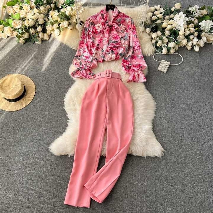 送料無料◆ D1776 3点セット ベルト付き ボウタイ 花柄 キャンディースリーブ ドレスシャツ ブラウス × ベルト付き ロング カラーパンツ セットアップ 《 ピンク》 上下セット ピンクコーデ ロングパンツ ピンクパンツ ロングブラウス パンツセット コーデセット シャツ 長袖 ロング インポート メール便 オケージョン おしゃれ 無地 袖あり インポートワンピース 上品 コーデセット シャツ カジュアル モード オフィスカジュアル 衣装
