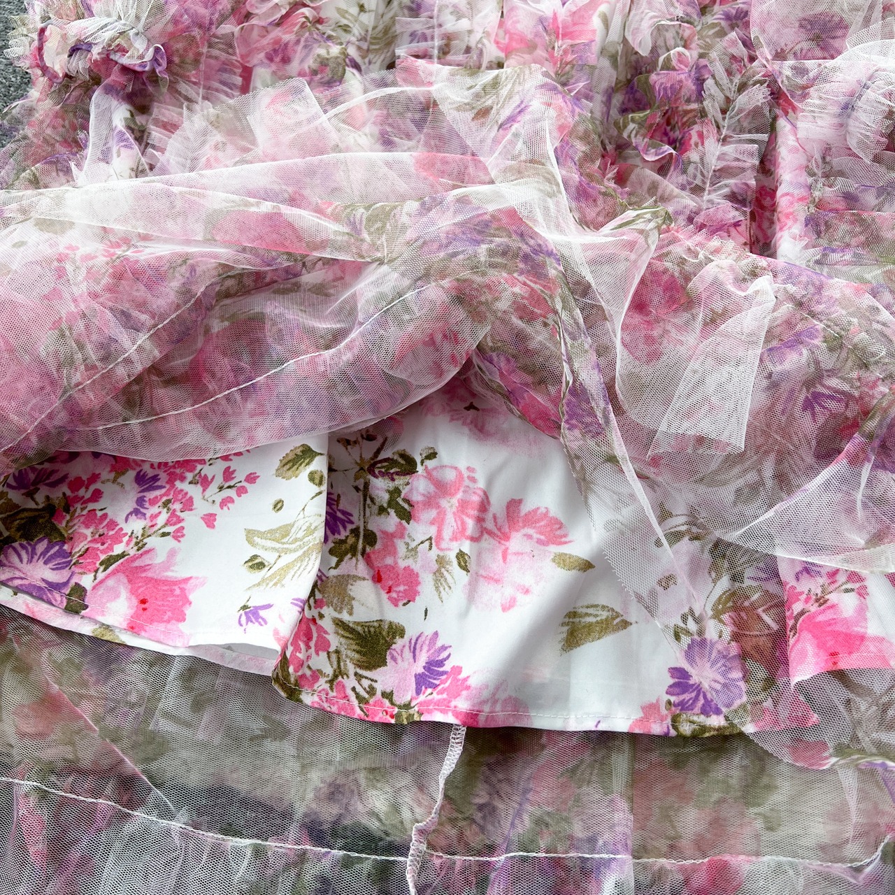 ピンク 、パープル、グリーンなどの淡いフラワープリントのチュール生地
