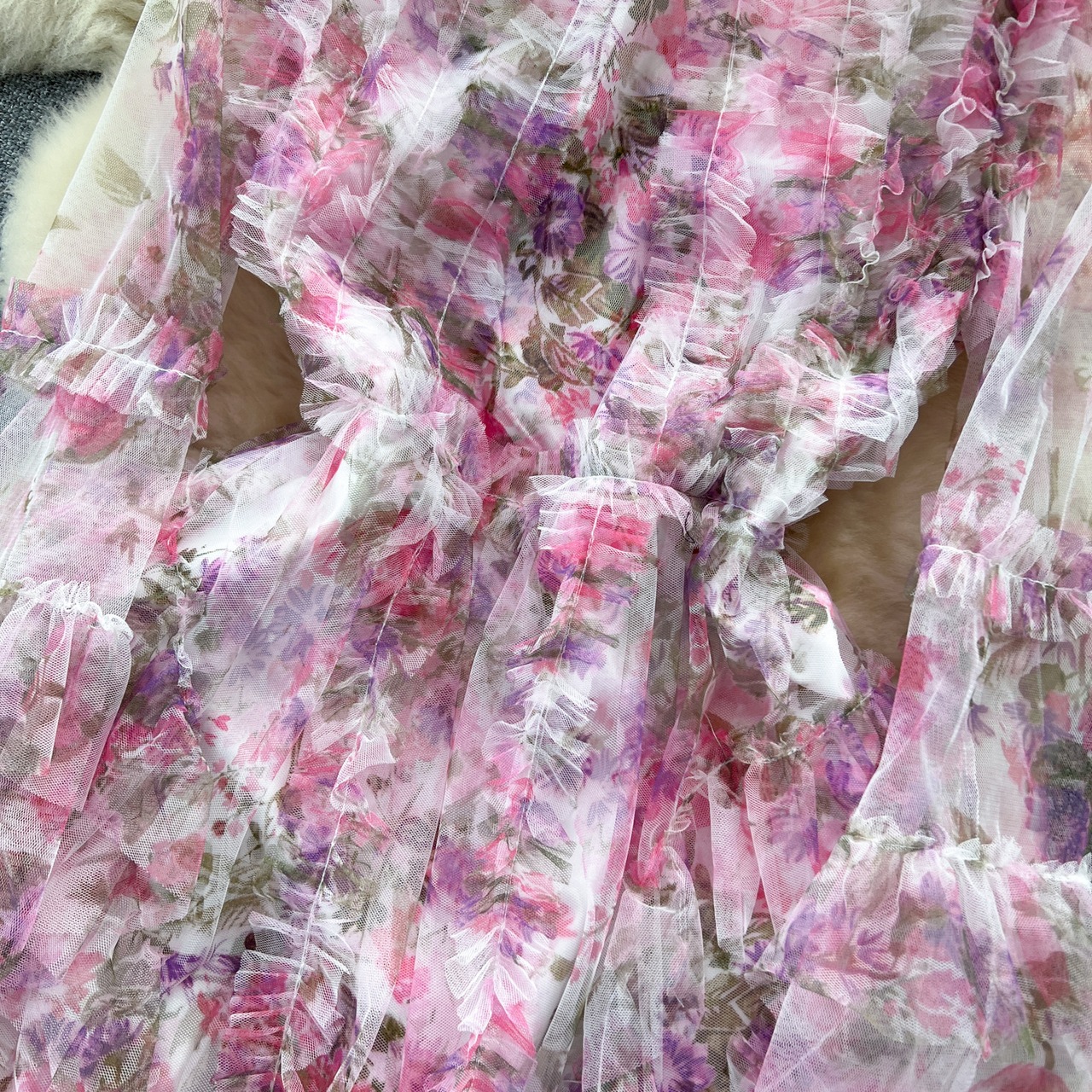 幻想的な花柄フリルのシアーワンピース