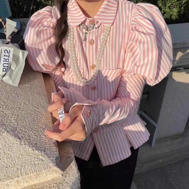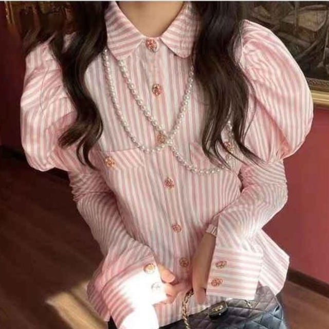 送料無料 ◆ D1779 襟付き ボリュームパフスリーブ ロングカフス ストライプ フラワーボタン ドレスシャツ ブラウス《ピンク×ホワイト》ブラウス ピンクブラウス シャツ ピンクシャツ トップス パワーショルダー クラシカルブラウス ロングカフス パワースリーブ バルーンスリーブ パフスリーブ ボーダー
