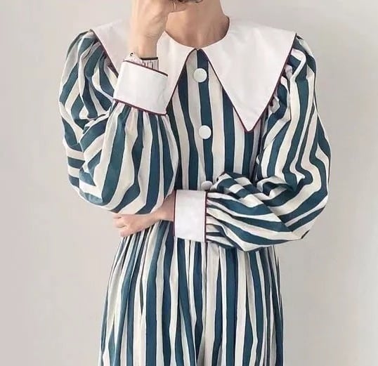 《訳ありアウトレット》送料無料 ◆ D1312 白襟 ストライプ パープルパイピング ホワイト ボタン ロング フレア ワンピース《ホワイト× グリーン》テールグリーン ホワイトボタン ホワイトカフス 緑 白 ヴィンテージ風 インポート パーティードレス クラシック ロングワンピ ミディ 膝下 ミモレ メール便 パーティーワンピ お呼ばれワンピース お食事 ひざ丈 おしゃれ 袖あり インポートワンピース 緑 ホワイト 上品 お出かけ B品 訳あり ワケあり 訳あり品