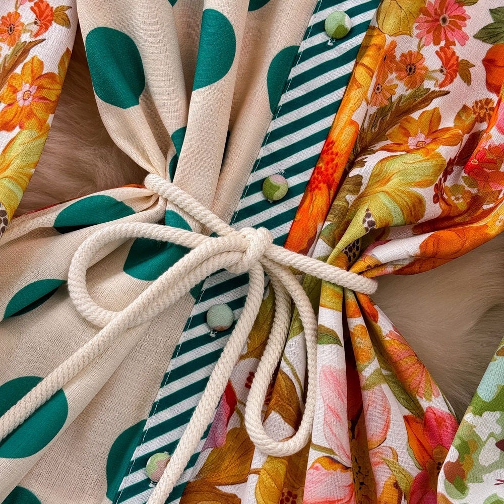送料無料 ◆ D1799 ロープベルト付き ドット ストライプ フラワー パッチワーク 前開き 襟付き 胡桃ボタン バルーンスリーブ ロング ワンピース《 マルチカラー 》前開き マキシ ベルト付き ウエストベルト 長袖 シャツワンピース マキシ 膝下 花柄 シャツワンピース インポート パーティードレス カジュアル 上品 メール便 パーティーワンピ お呼ばれワンピース お食事 ひざ丈 おしゃれ カラフル 袖あり インポートワンピース 華やか 柄ワンピース 柄物 柄ワンピ 発表会 卒業パーティー 衣装