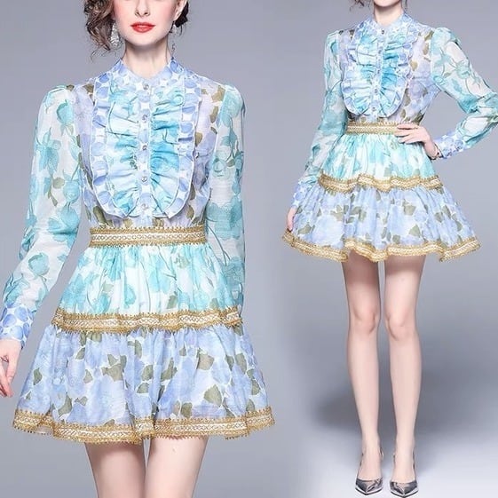 送料無料 ◆ D1647 フラワー × ドット ゴールド リボン ライン バルーンスリーブ ティアード ミニ ワンピース《ブルー 》ブルー ブルー ミックス 長袖 ミニワンピ 水色 ライトブルー パステルカラー カラフルワンピース インポートワンピース パーティードレス 衣装 メール便 袖付き お食事 ひざ丈 おしゃれ 無地 ロングワンピース 袖あり インポートワンピース お呼ばれ 衣装 カジュアル モード 膝上 ミディ お出かけ ミニドレス 青ドレス ブルー ドレス