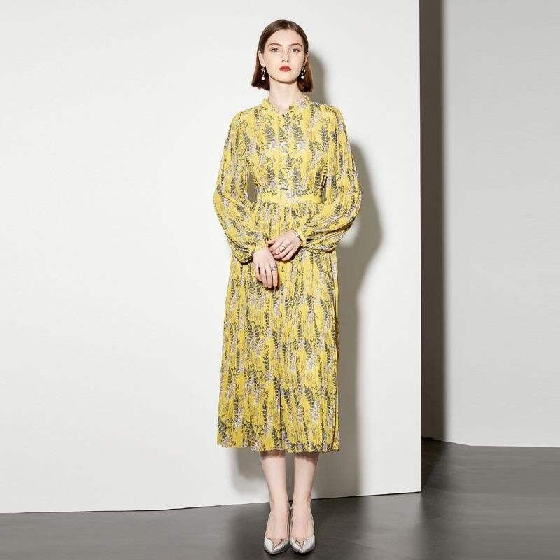 送料無料 ◆ D1813-2 ベルト付き 胡桃ボタン プリーツ バルーンスリーブ ボタニカル ロング ワンピース《 イエロー 》黄色 長袖 花柄 ボタニカル インポートワンピース パーティードレス 衣装 メール便 パーティーワンピ 袖付き カジュアル お食事 ひざ丈 おしゃれ 無地 ロングワンピース 袖あり インポートワンピース お呼ばれ 結婚式 お出かけ 上品 卒業パーティー