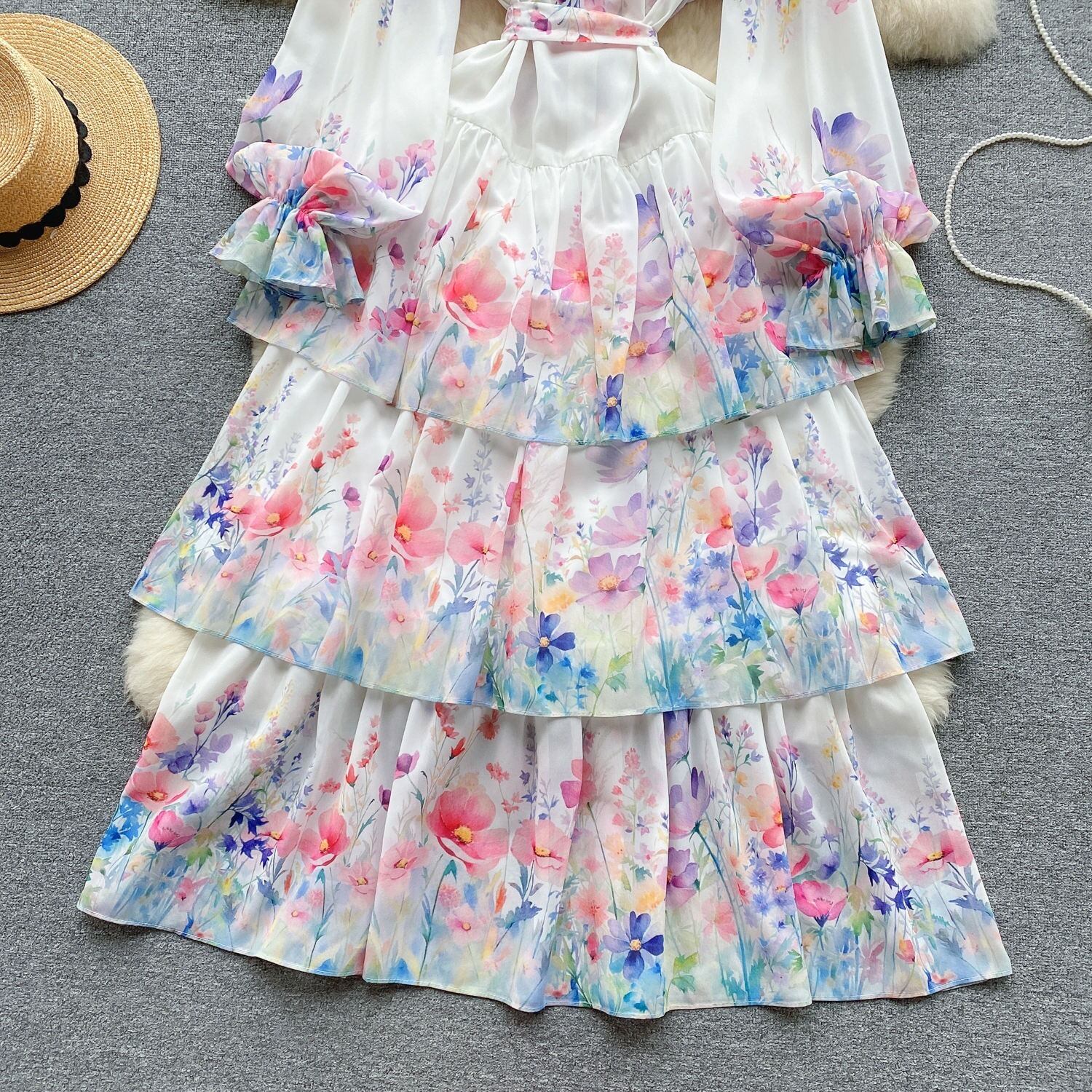 送料無料 ◆ D1834 リボン付き ボウタイ 花柄 ホワイトボタン キャンディースリーブ ティアード ロング ワンピース《 ホワイト×パステル 》フラワー 花柄 パステル 花柄 柄物スカート 柄物 カラフル インポートワンピース パーティードレス メール便 パーティーワンピ お食事 ひざ丈 長袖 おしゃれ 袖あり 衣装 エレガント 同窓会 卒業パーティー 謝恩会