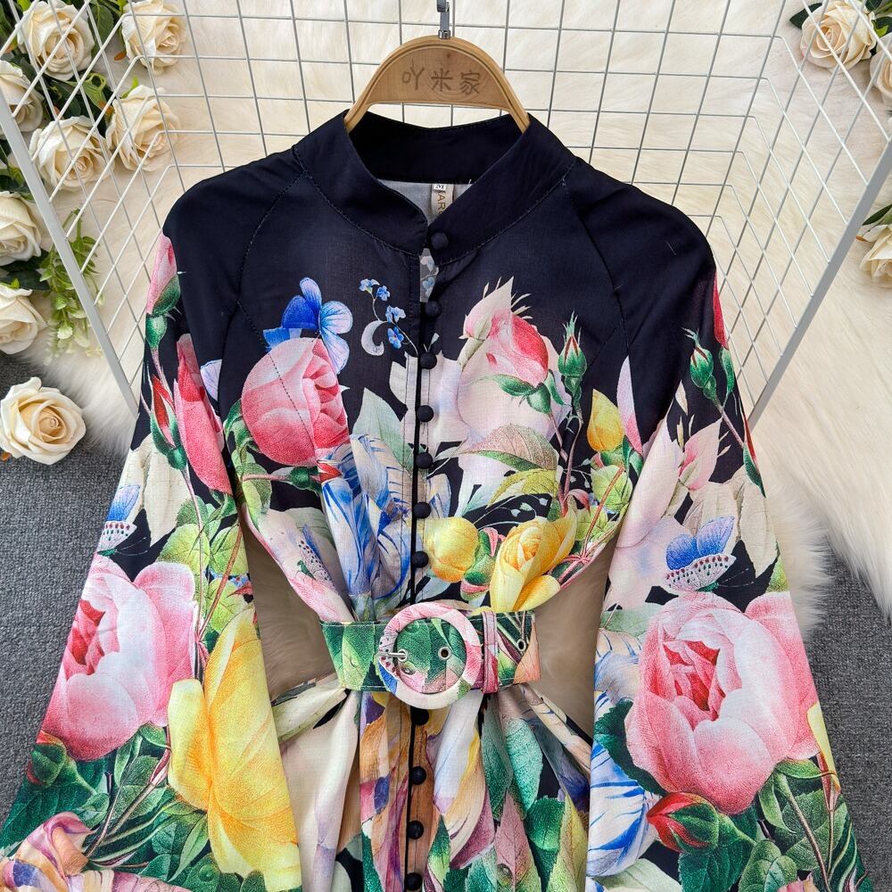 送料無料 ◆ D1859-2 フラワーベルト付 チューリップ フラワー 前開き バルーンスリーブ 胡桃ボタン ロング ワンピース《 ブラック×カラフル 》ホワイト レッド ピンク パステル 前開き 長袖 マキシ ロングカフス ベルト付き ウエストベルト シャツワンピース 膝下 ミモレ フラワー シャツワンピース インポート パーティードレス エレガント メール便 パーティーワンピ お食事 おしゃれ 上品 マルチカラー 袖あり インポートワンピース クラシカル 発表会 同窓会 謝恩会