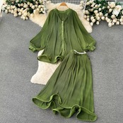 《訳ありアウトレット》送料無料 ◆ D1234 プリーツ 前開き 長袖 フレア ブラウス & フレアスカート セットアップ《 ホワイト/オリーブグリーン 》2点セット 上下セット ツーピース 2ピース 黄緑 緑 白 モスグリーン グリーン シャツ ブラウス 無地 パーティードレス お呼ばれ メール便 フリル パーティー 結婚式 お呼ばれ ワンピース ドレス ロングスカート 長袖 ラグランスリーブ シルバーボタン アウトレット B品 訳あり 訳あり品 セール品