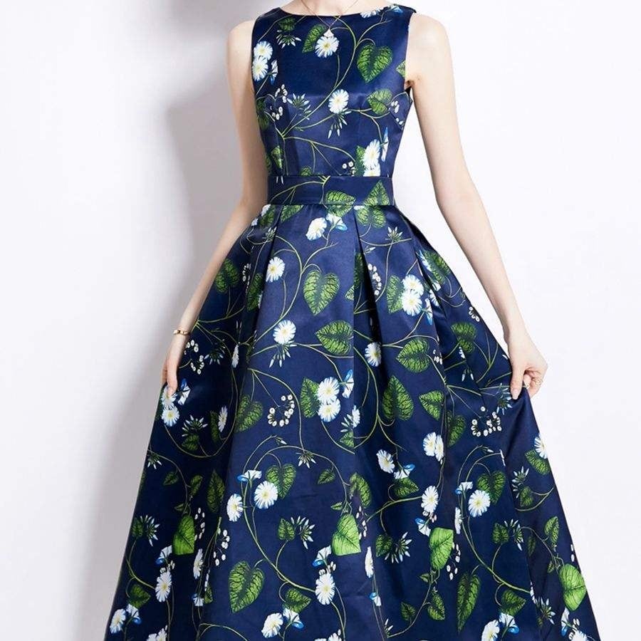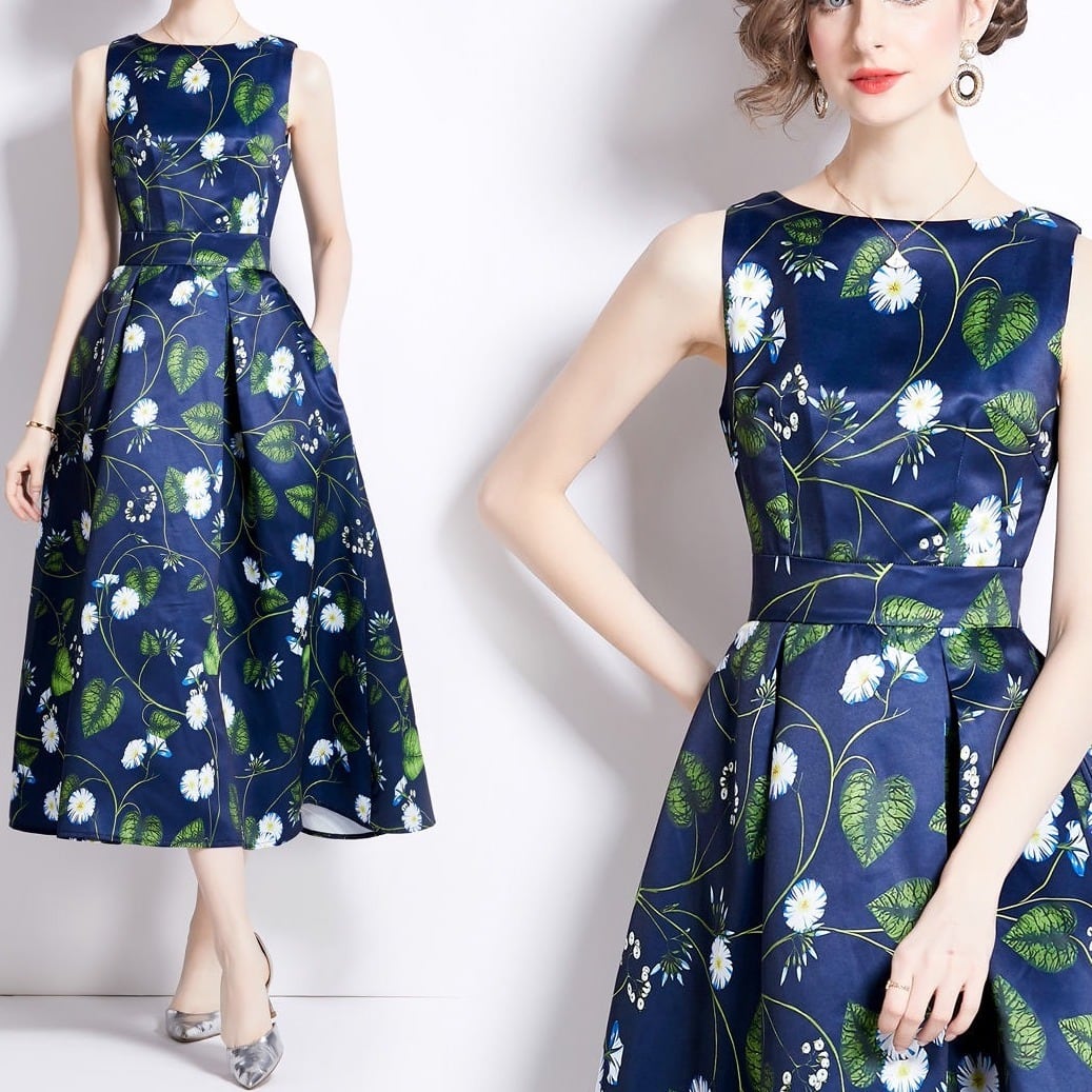 送料無料 ◆ D1896 フラワー ウエストボックスプリーツ ノースリーブ ロング ワンピース 《ネイビー×ホワイト 》大柄 カラフル 鮮やか 青 ブルードレス ブルー系 花柄 フラワー フォーマル フラワー パープル 花柄ワンピース 膝丈 膝下 ミモレ マキシ ロング 柄物 ウエディング メール便 エレガント パーティー お出かけ 上品 衣装 パーティードレス 発表会 結婚式 ガーデン セミフォーマル プリンセスライン