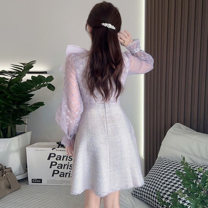 《訳ありアウトレット》送料無料 ◆ D1781 ブローチ付き サイドリボン プリーツネック パール ビジュー レース × ツイード ミニ ドレス ワンピース《ラベンダー》パープル 紫 ラベンダー ドレス ミニ ミニドレス キラキラ 白レース襟 ミックスツイード 光沢 インポート パーティードレス お出かけ パープルワンピース パーティーコーデ お呼ばれ 袖あり インポートワンピース 卒業パーティー 衣装 発表会 結婚式 謝恩会 同窓会 パーティー 訳あり 訳あり品 アウトレット B品