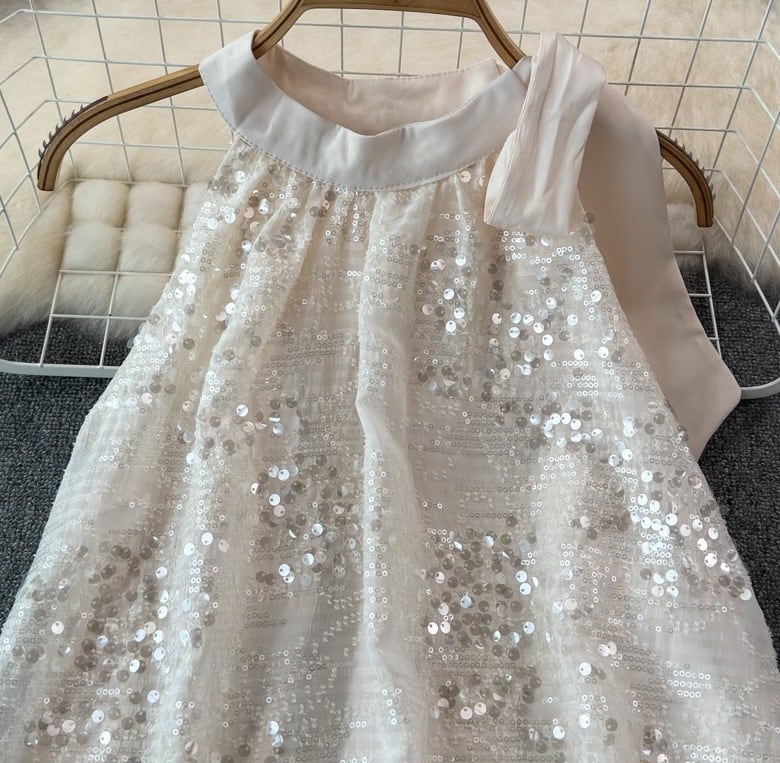 送料無料 ◆ D1923 ホルターネック リボン クリア スパンコール ノースリーブ ドレスシャツ ブラウス 《オフホワイト》白ブラウス スパンコールブラウス フレア 無地 ノースリーブブラウス ノースリーブシャツ フォーマル 白コーデ スパンコール 装飾 セミフォーマル トップス フリル袖 インポート パーティードレス カジュアル メール便 オーケージョン モード 衣装 おしゃれ お出かけ お呼ばれ