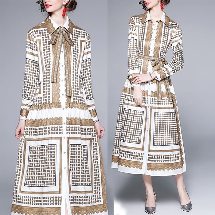 《訳ありアウトレット》送料無料 ◆ D1769 ボウタイリボン付き 前開き 長袖 ジオメトリック ロング ワンピース《ホワイト×キャメル》白 柄 ゴールド バイカラー 幾何学模様 ロングスリーブ クラシック 柄物ワンピース 柄ワンピース 柄物 レトロ ヴィンテージ風 ワンピース クラシックワンピース ドレスワンピース 袖あり 長袖 ミモレ 膝下 膝下丈 マキシワンピース お呼ばれ 上品 カジュアル 衣装 エレガント メール便 ベージュ ブラウン アウトレット B品 訳あり 訳あり品 セール品