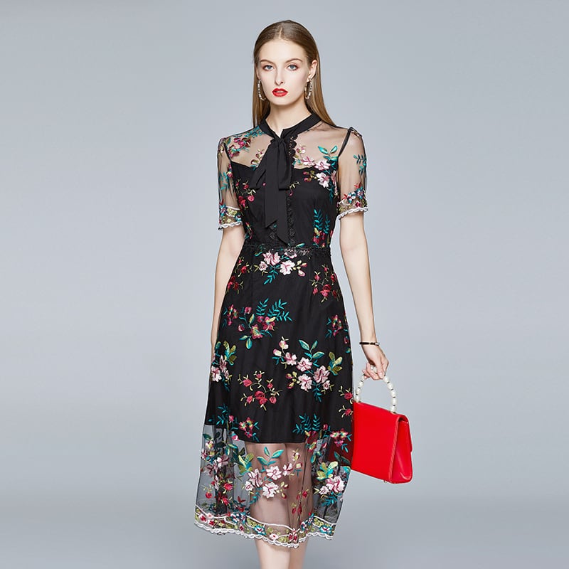 《訳ありアウトレット》送料無料 ◆ D183 ボウタイ フラワー 刺繍 レース ロング ワンピース《オフホワイト/ブラック》レッド 赤 緑 グリーン 刺繍 半袖 チュール フラワー Aライン 半袖 花柄ワンピース 膝丈 膝下 ミモレ ロング 袖あり カラフル 裏地あり 赤い花 花刺繍 パーティードレス 卒業パーティー 謝恩会 同窓会 発表会 訳あり 訳あり品 アウトレット B品