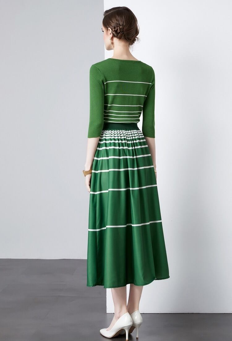 《訳ありアウトレット》送料無料 ◆ D1767 ホワイト ストライプ ニット トップス & フレア ロングスカート セットアップ 《グリーン》マルチストライプ 上下セット 2点セット セットコーデ ツーピース インポートセットアップ パーティードレス ボーダー 上下 ニット フレアスカート 衣装 Vネック 2点 パーティーワンピ お食事 ひざ丈 おしゃれ 袖あり オフィスカジュアル カジュアルコーデ アウトレット B品 訳あり 訳あり品 セール品