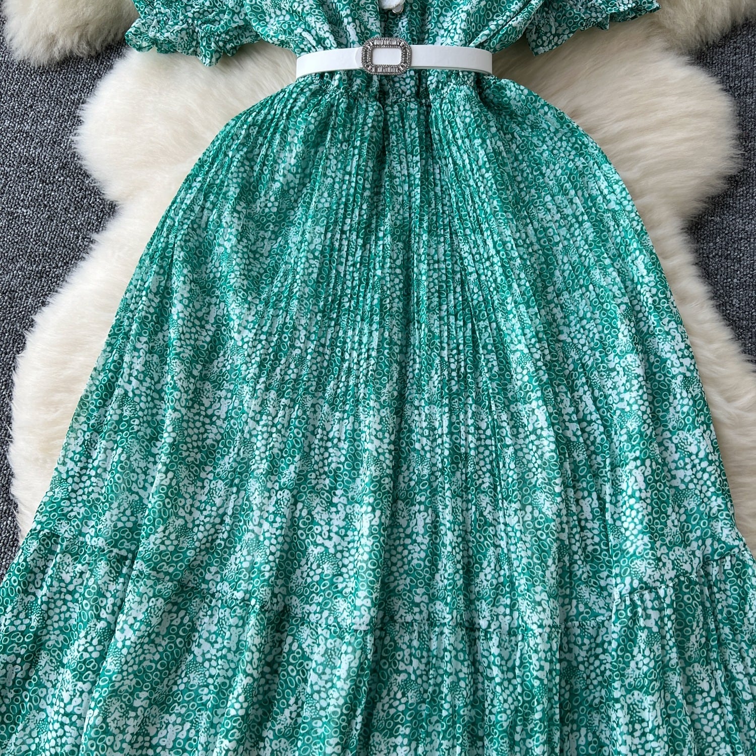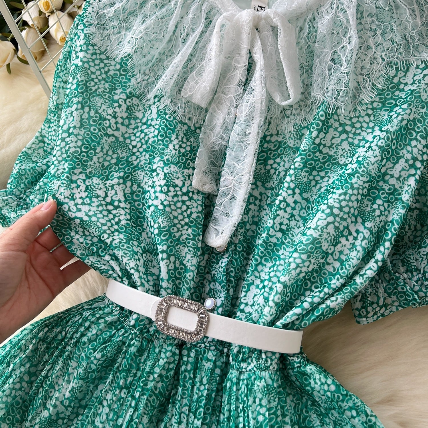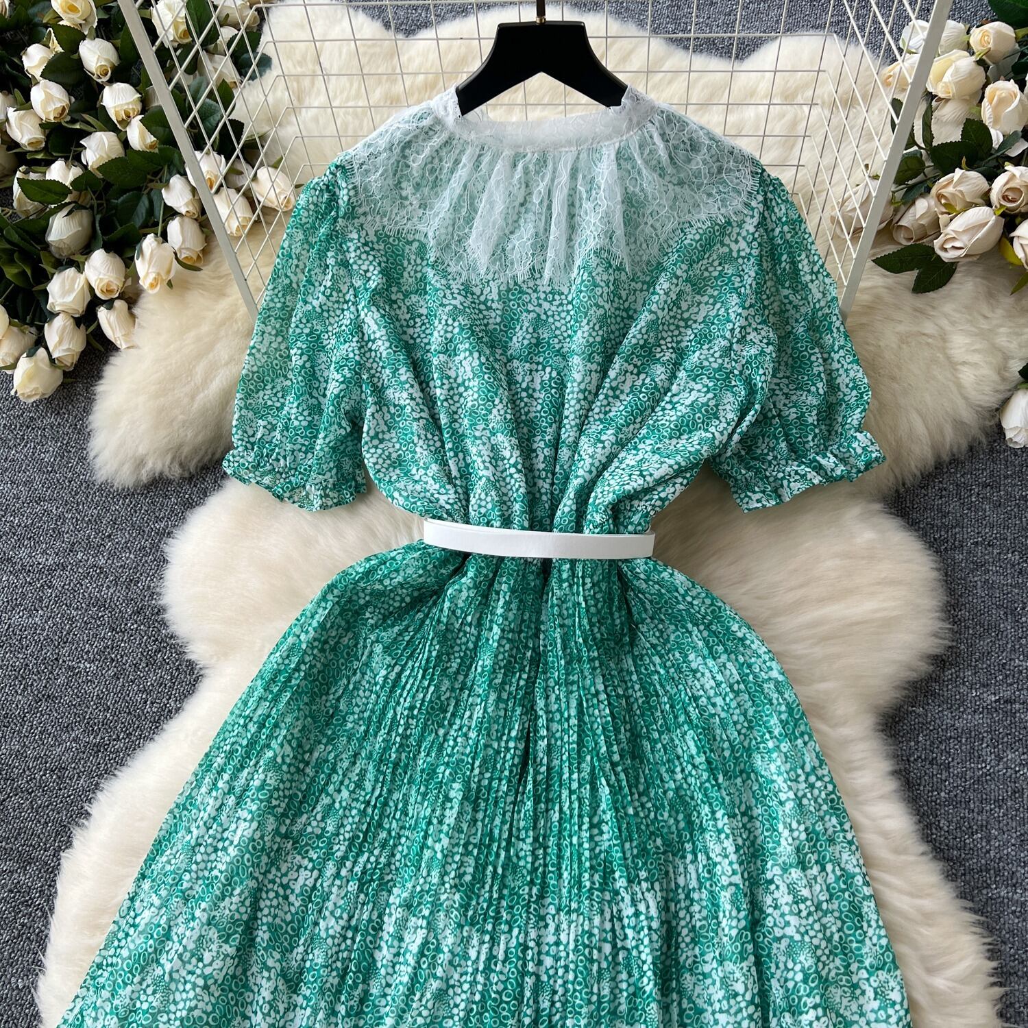 SALE セール 送料無料 ◆ D1958 ホワイトベルト付き レース襟 パフスリーブ ジオメトリック ロング ワンピース《 グリーン 》緑 ホワイト ウエストゴム 白 無地 襟付きワンピース 襟つき バイカラー 半袖 膝丈 クラシカル インポート パーティードレス カジュアル メール便 パーティーワンピ お呼ばれワンピース お食事 おしゃれ 上品 柄物ワンピース インポートワンピース 柄ワンピース 発表会 ウェディング おでかけ 衣装 セミフォーマル
