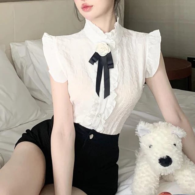 送料無料 ◆ D1965 カメリア ブラックリボン ブローチ付き フリルスリーブ ビジューボタン ドレスシャツ ブラウス《 ホワイト 》ふわふわ フェアリー シャツ ドレスブラウス 白ブラウス 白シャツ フリルブラウス 無地 ノースリーブ 半袖 インポート パーティードレス メール便 袖あり ノースリーブ フレンチスリーブ カジュアル トップス 衣装 クラシカル 上品 エレガント